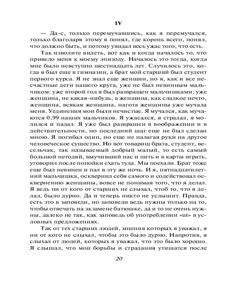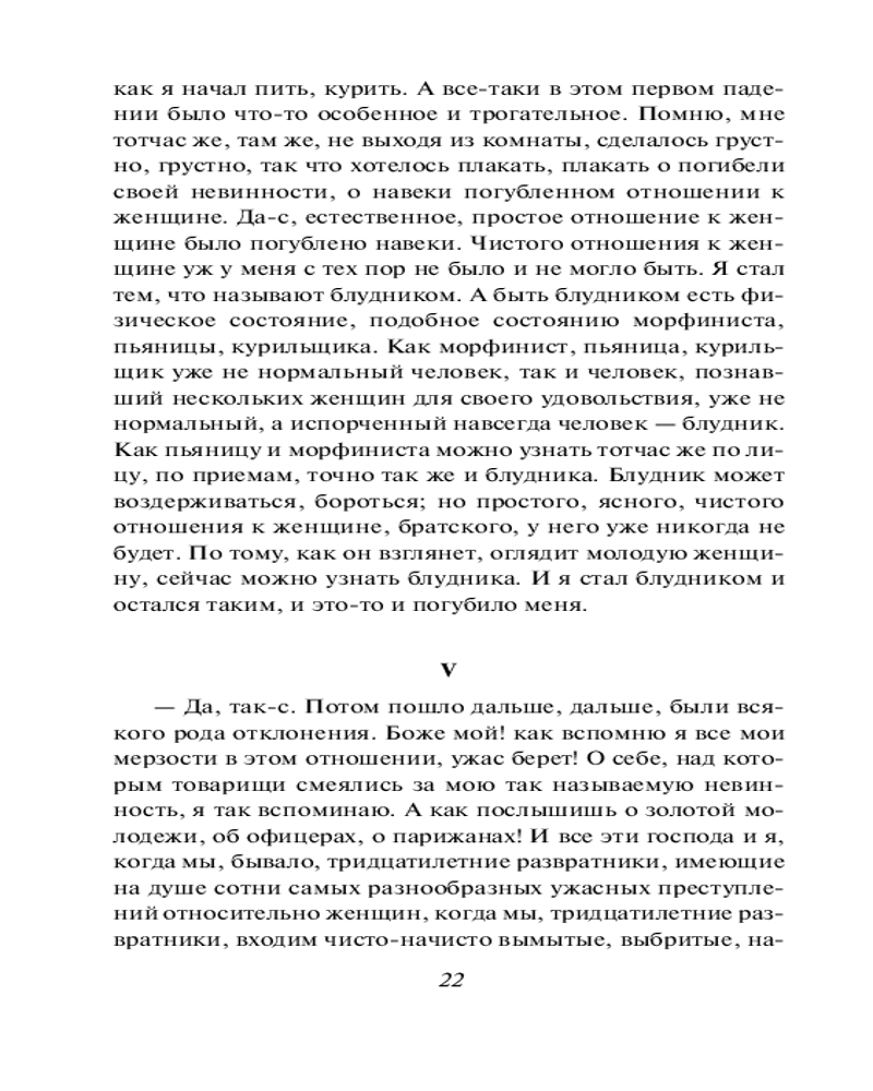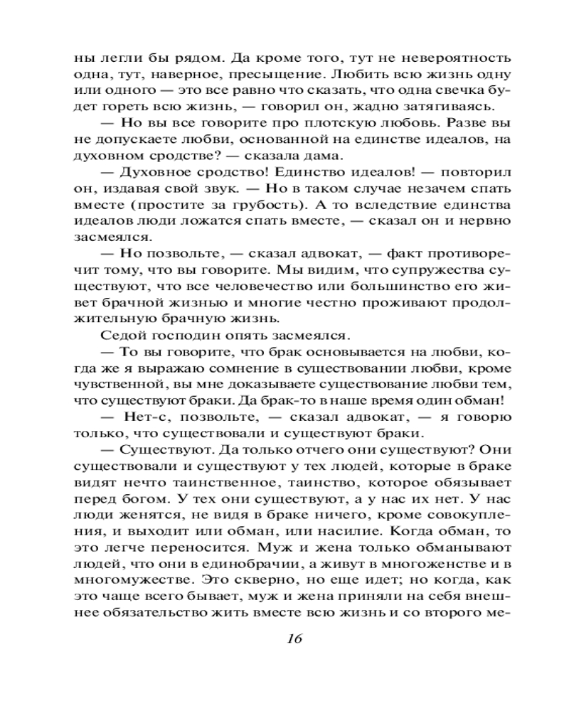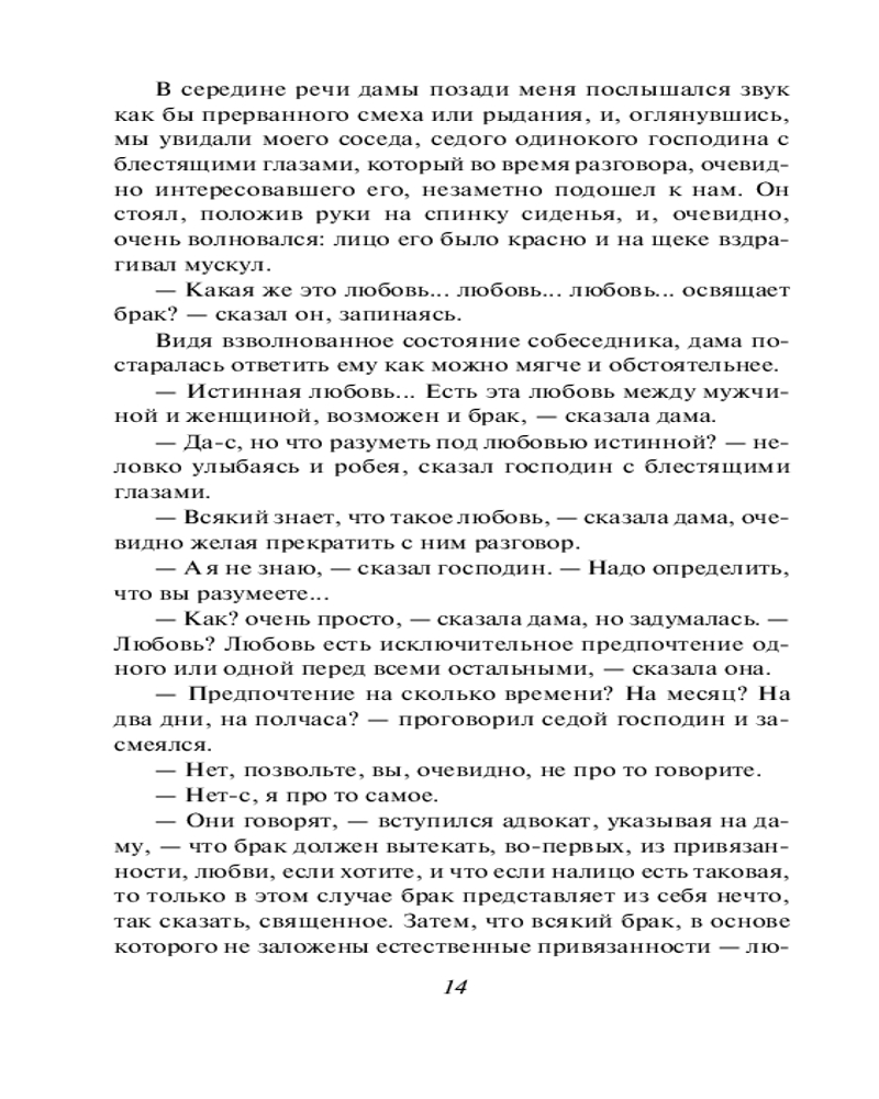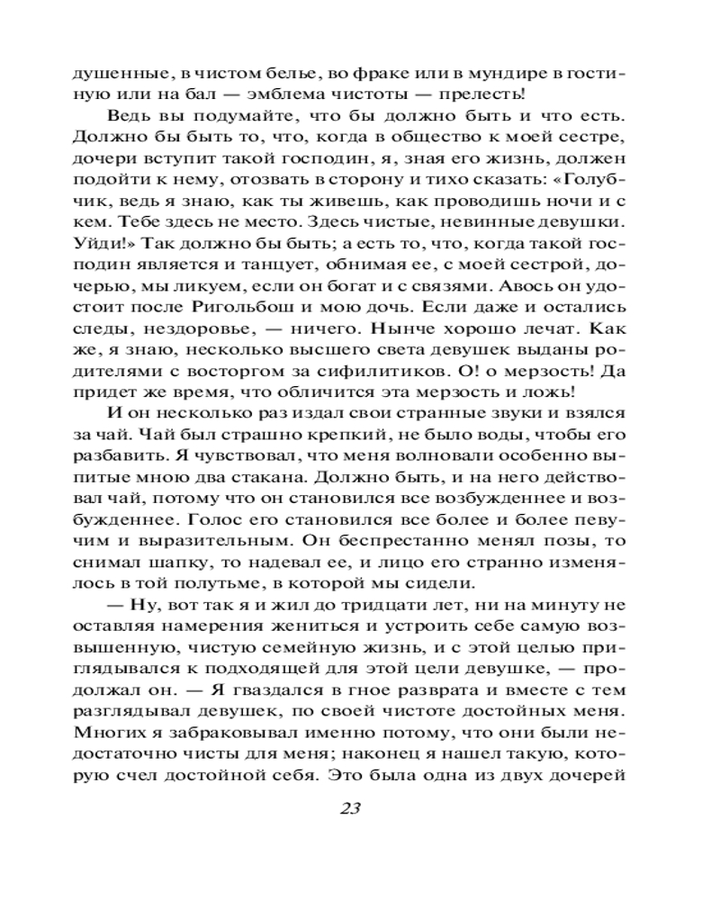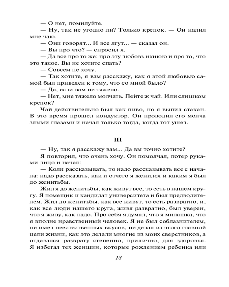 Серия: Всемирная литература (новое оформление) «Ведь она против воли моей завладела мною!» — восклицает несчастный Иртенев. Автор оставил ему выбор между самоубийством и убийством той, которая «завладела». Такова расплата за добрачный секс, за то, «что все делают». Ибо в глазах графа-философа «делать как все» — значит, быть мертвым, не пробудиться к истинной жизни.