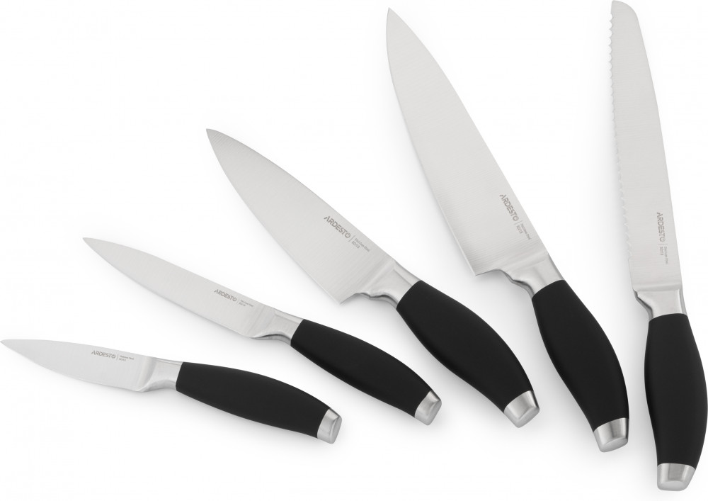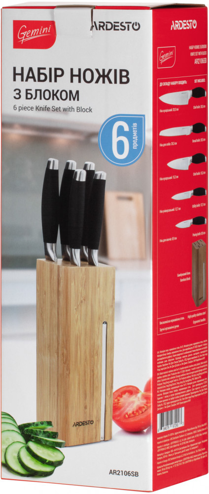 Набор состоит из пяти ножей серии Gemini, в который входят два поварских ножа, универсальный нож, нож для хлеба, нож для овощей и бамбуковый блок. Лезвия изготовлены из нержавеющей стали 2CR13, а ручки с нержавеющей стали 430 с покрытием TPR.