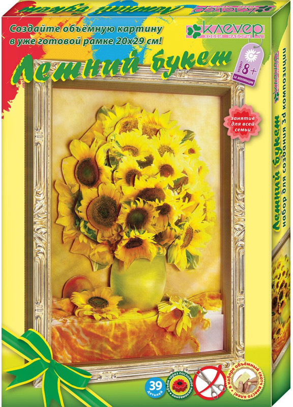 Картину «Летний букет» можно сделать без клея и ножниц, в технике 3D-аппликации. Жизнерадостные подсолнухи чудесно смотрятся в ярких солнечных лучах на картине. Работая с набором, ребёнок учится складывать трёхмерное изображение из частей, составляя перспективу. Рамку собирать не нужно — красочная и глубокая готовая рамка входит в набор.