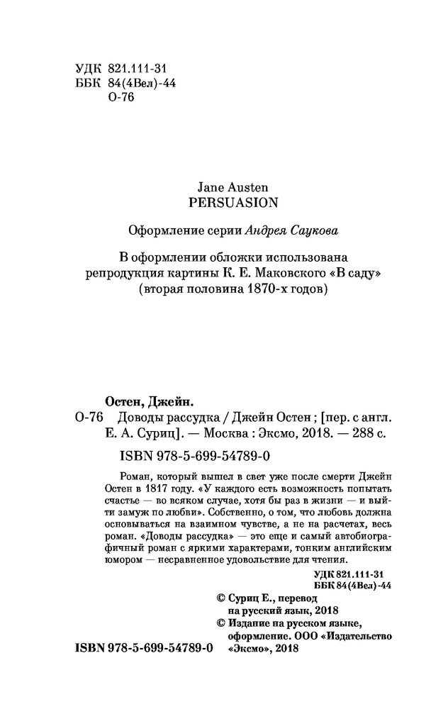 Доводы рассудкаВ данный момент этот товар отсутствует в продаже. Возможно, у нас найдется аналогичный или похожий товар здесь. Серия: Pocket Book (обложка) Роман, который вышел в свет уже после смерти Джейн Остен в 1817 году. «У каждого есть возможность попытать счастье — во всяком случае, хотябы раз в жизни — и выйти замуж по любви». Собственно о том, что любовь должна основываться на взаимном чувстве, а не на расчетах, весь роман. «Доводы рассудка» это еще и самый автобиографичный роман с яркими характерами, тонким английским юмором — несравненное удовольствие для чтения. |