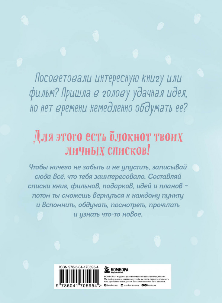Блокнот «Мои мечты и планы»В данный момент этот товар отсутствует в продаже. Возможно, у нас найдется аналогичный или похожий товар здесь. Серия: WTJ_inspiration. Блокноты Бывало ли у вас так, что друг посоветовал вам непременно прочитать какую-нибудь очень интересную книгу или посмотреть фильм, а вы записали это на клочке бумаги или в заметки в телефон и благополучно забыли об этом? Только представьте, сколько интересного мы упускаем в жизни, только потому что забыли или не записали! |