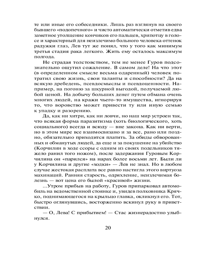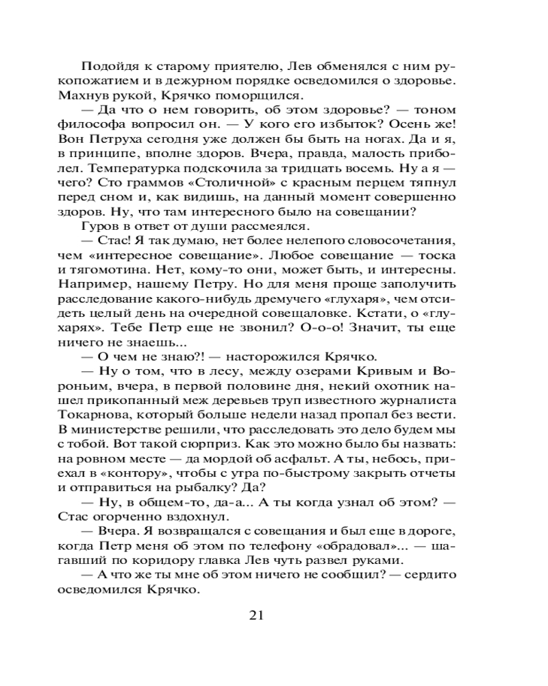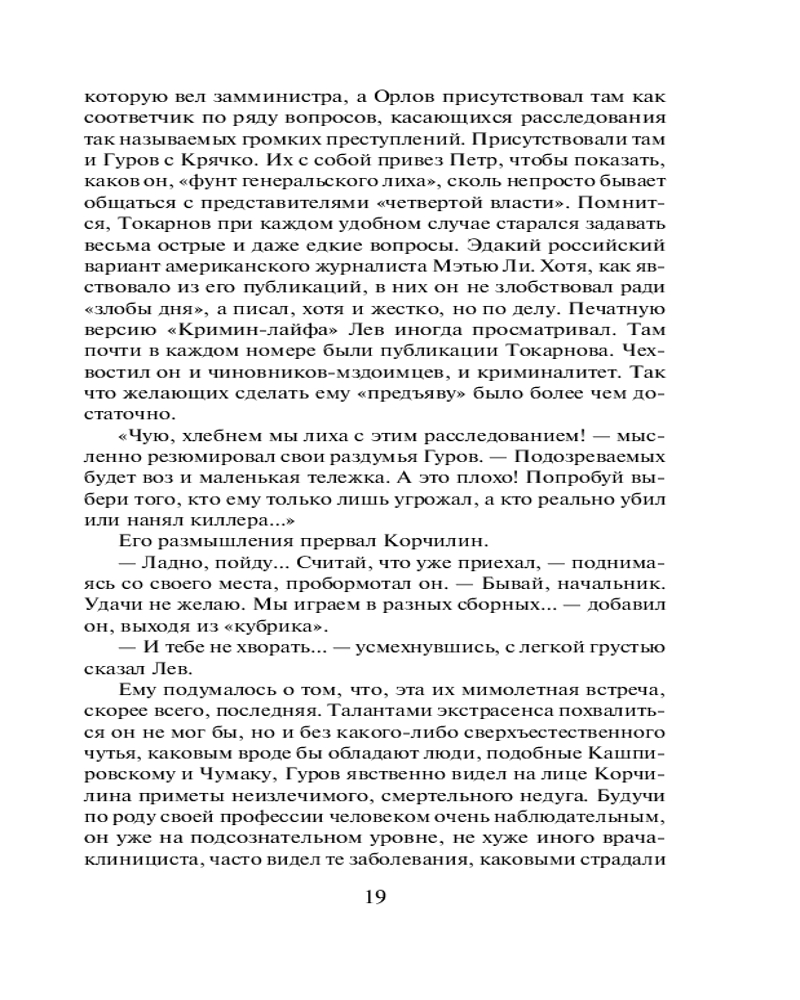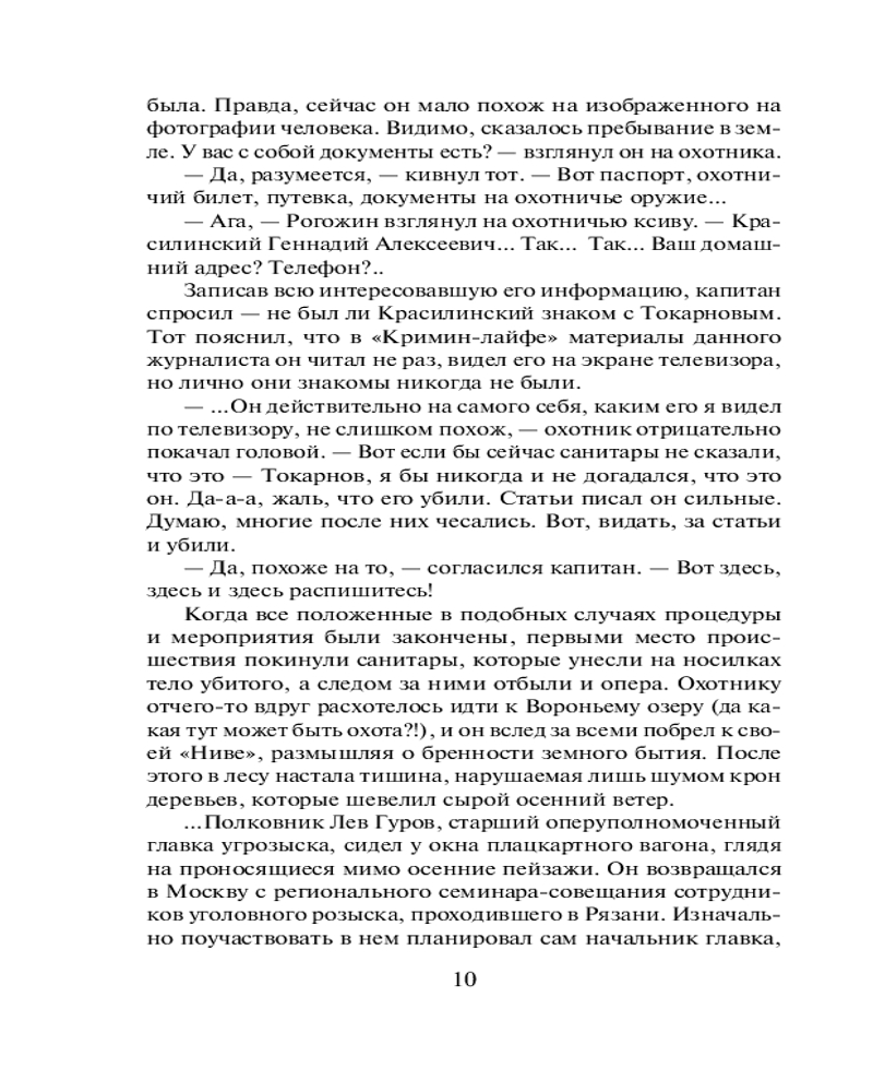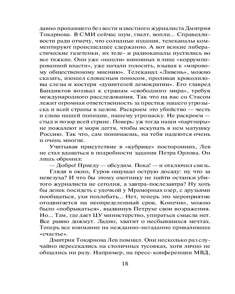 Серия: Черная кошка В подмосковном лесу обнаружен труп известного криминального журналиста Дмитрия Токарнова. Расследовать это резонансное преступление поручено полковникам МВД Гурову и Крячко. Сыщики быстро выясняют, что убитый успел нажить себе множество врагов — от высоких чиновников до преступных авторитетов. Любой из них мог желать Токарнову смерти. Однако, у наиболее вероятных заказчиков убийства в результате тщательной проверки оказывается алиби. Оперативники ищут новые зацепки и вскоре выходят на одиозную личность, о которой в преступном мире ходят настоящие легенды... |