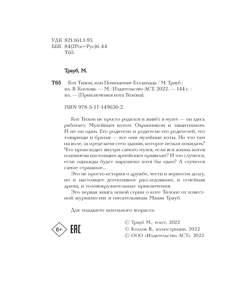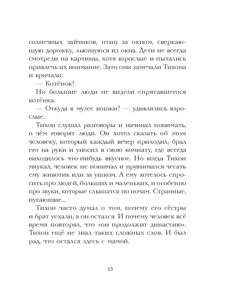 💳 Оплатить за товар можно при получении 🇰🇿 Есть бесплатная доставка по Казахстану 🎁 Копите бонусы с каждой покупки Серия: Приключения кота Тихона Кот Тихон не просто родился и живёт в музее — он здесь работает. Музейным котом. Охранником и защитником. И не он один. Его родители и родители его родителей, его товарищи и братья — все они музейные коты. Но что там на воле, за пределами стен здания, которое нельзя покидать? Что происходит внутри самого музея, если вся жизнь котов подчинена настоящим армейским правилам? И что случится, если однажды будет нарушено хотя бы одно? А случится самое страшное... |