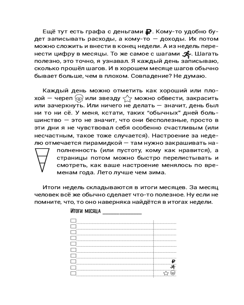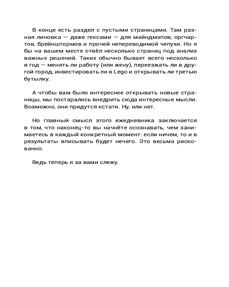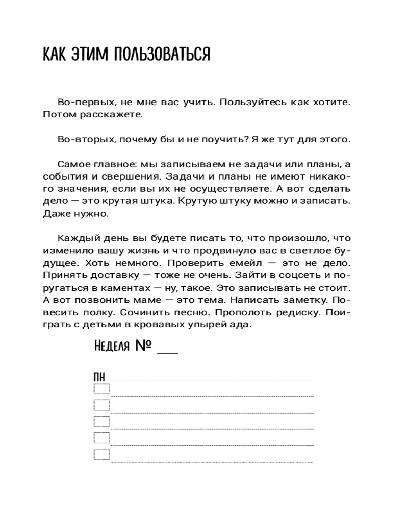 💳 Оплатить за товар можно при получении 🇰🇿 Есть бесплатная доставка по Казахстану 🎁 Копите бонусы с каждой покупки Серия: Звезда нонфикшн. Практикум Внезапно выяснилось, что люди недовольны ежедневниками. Покупают пачку бумаги в красивой обложке, а хотят счастья. Заполняют список дел, а хотят прокачать самоконтроль. Всем нужна дисциплина, а не план захвата мира. Всем нужна логика заполнения, а не набор пустых страниц. Всем нужна свобода, а не календарь, который каждый год новый. К тому же календарь есть в телефоне, а пятницу в любом случае не пропустишь. |