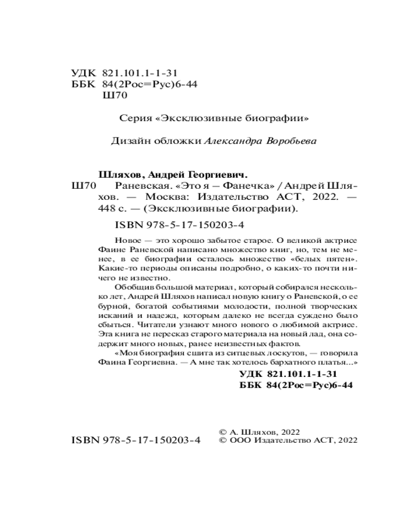 Серия: Эксклюзивные биографии Андрей Шляхов — прекрасный писатель в жанре юмористической прозы, биографии и мемуаров. Значимое место в собрании сочинений писателя занимают биографические исследования многогранных и противоречивых исторических фигур, и выдающихся личностей. Книга «Раневская. Я — выкидыш Станиславского» не пересказ старого материала на новый лад, она содержит много новых, ранее неизвестных фактов о Фаине Георгиевне. Обобщив большой материал, который собирался несколько лет, Андрей Шляхов написал книгу о Раневской, о ее бурной, богатой событиями жизни, полной творческих исканий и надежд, которым далеко не всегда суждено было сбыться. |