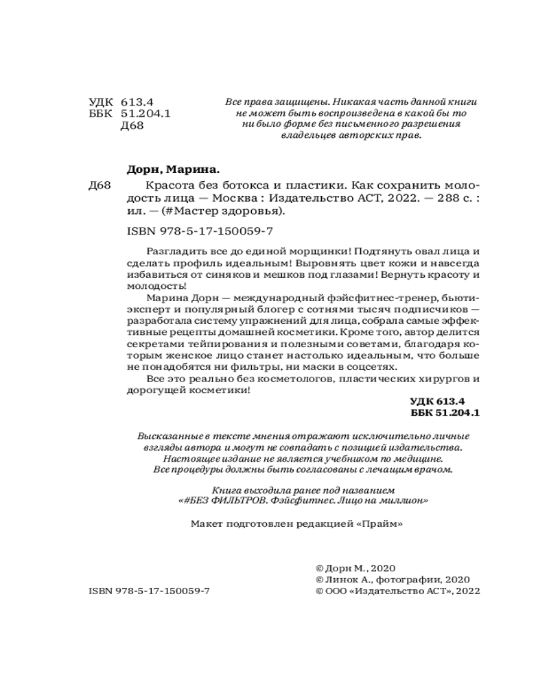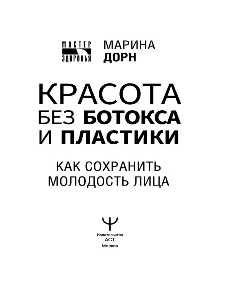 Красота без ботокса и пластики. Как сохранить молодость лицаВ данный момент этот товар отсутствует в продаже. Возможно, у нас найдется аналогичный или похожий товар здесь. Серия: Мастер здоровья Марина Дорн — международный фэйсфитнес-тренер, бьюти-эксперт на ТВ и известный блогер с сотнями тысяч подписчиков. |