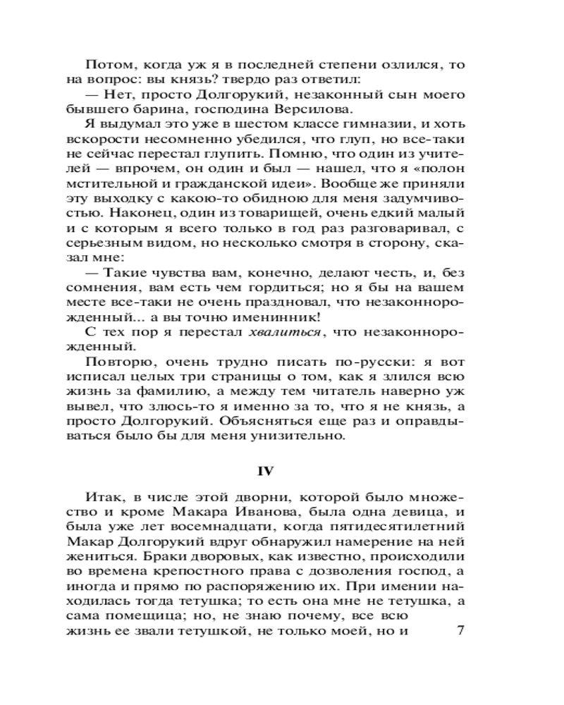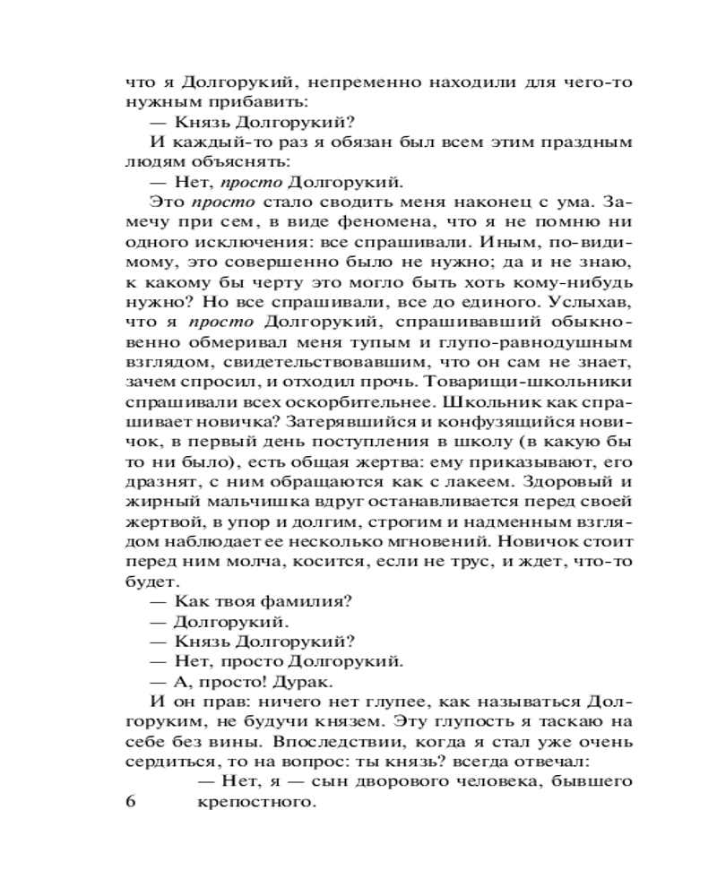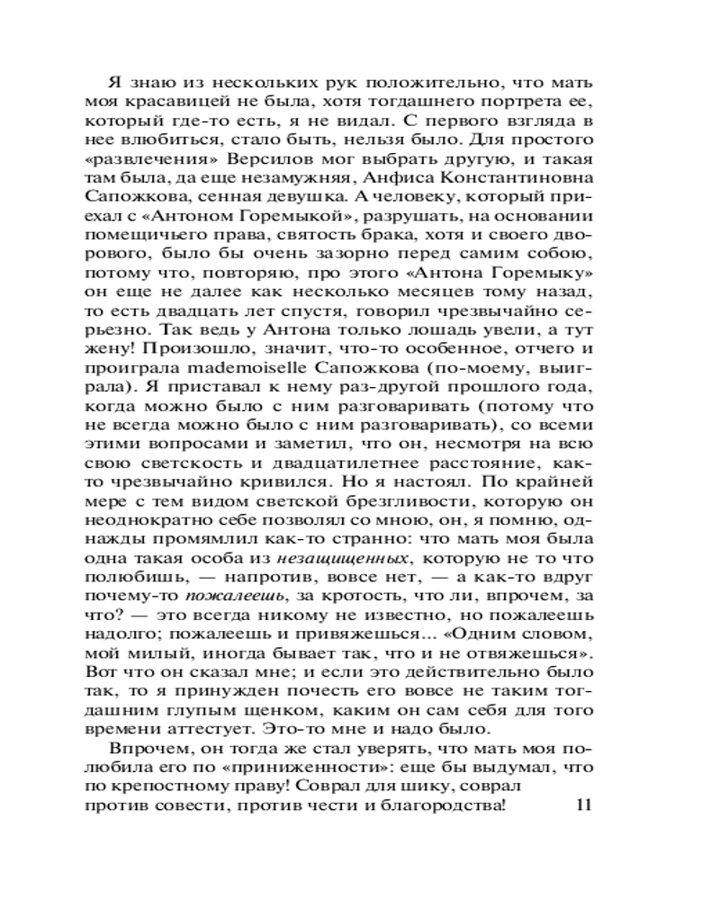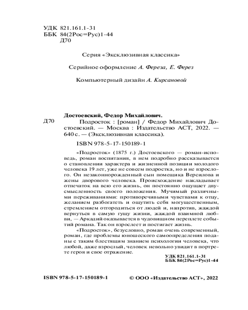 Серия: Эксклюзив: Русская классика «Подросток» (1875 г.) Достоевского — роман-исповедь, роман воспитания, в нем подробно рассказывается о становлении характера и жизненной позиции молодого человека 19 лет, уже не совсем подростка, но и не взрослого. Он незаконнорожденный сын помещика Версилова и жены дворового человека. Происхождение накладывает отпечаток на всю его жизнь, он постоянно ощущает двусмысленность своего положения. Мучимый различными переживаниями: противоречивыми чувствами к отцу, желанием разбогатеть и ощутить себя могущественным, стремлением отгородиться от людей и, напротив, жаждой вернуться в самую гущу жизни, жаждой взаимной любви, — Аркадий оказывается в чудовищном переплете событий романа. Так он взрослеет и постигает жизнь. |