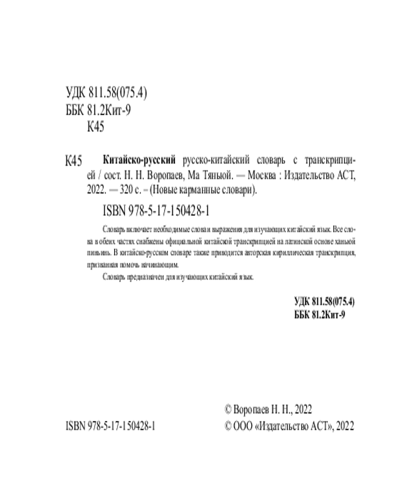 Серия: Новые карманные словари Словарь включает необходимые слова и выражения для изучающих китайский язык. Все слова в обеих частях снабжены официальной китайской транскрипцией на латинской основе ханьюй пиньинь. В китайско-русском словаре также приводится авторская кириллическая транскрипция, призванная помочь начинающим. |