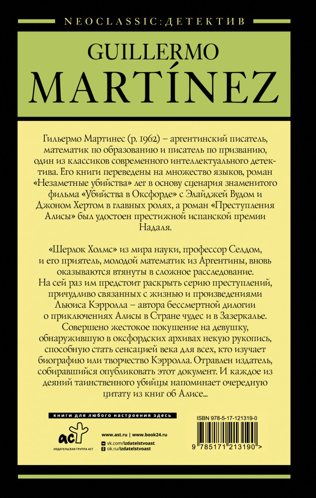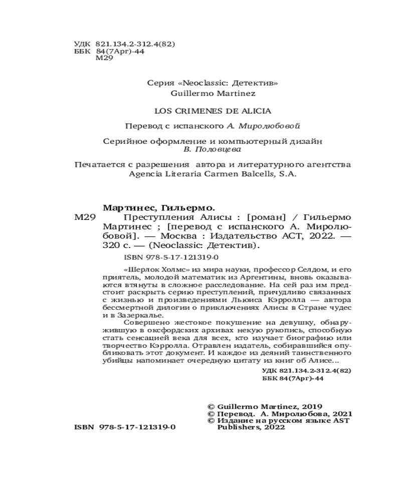 «Шерлок Холмс» из мира науки — профессор Селдом и его приятель, молодой математик из Аргентины, вновь оказываются втянуты в сложное расследование. На сей раз им предстоит раскрыть серию преступлений, причудливо связанных с жизнью и произведениями Льюиса Кэрролла — автора бессмертной дилогии о приключениях Алисы в Стране чудес и в Зазеркалье.