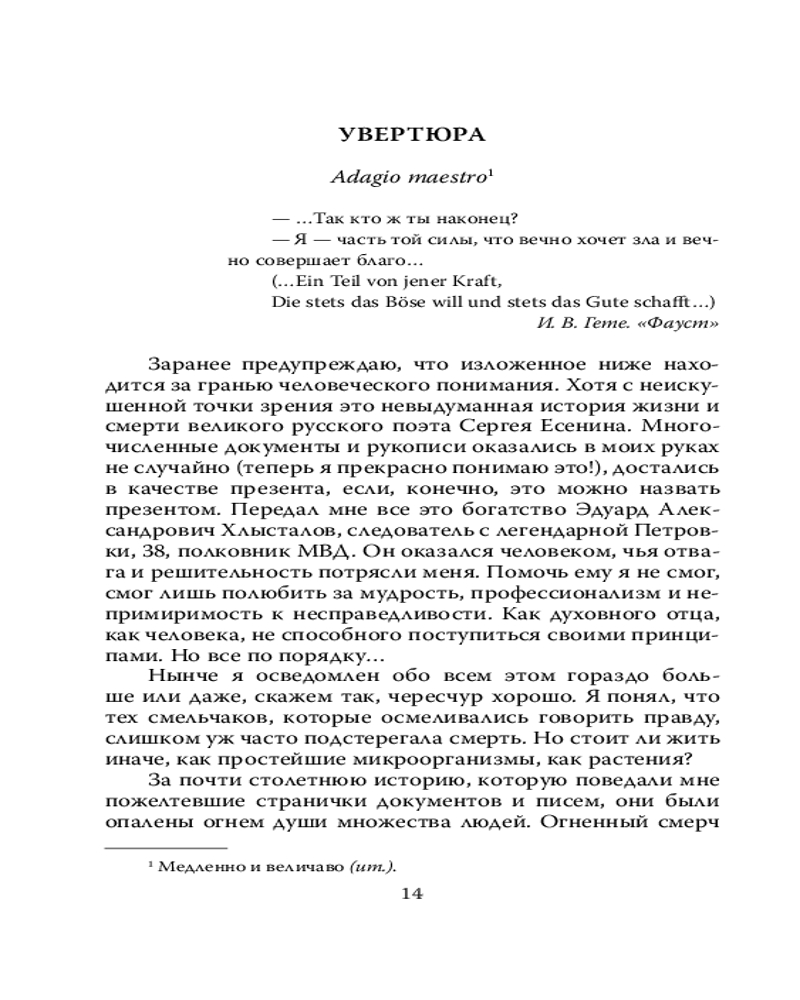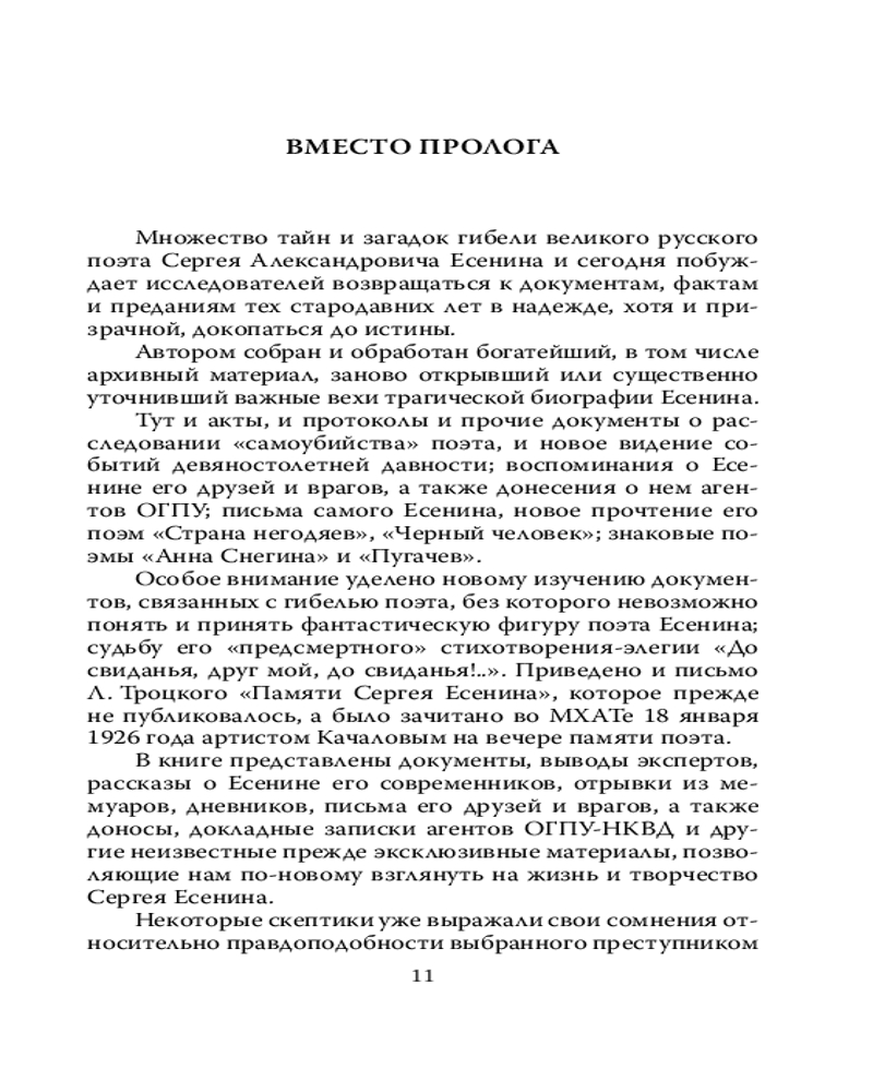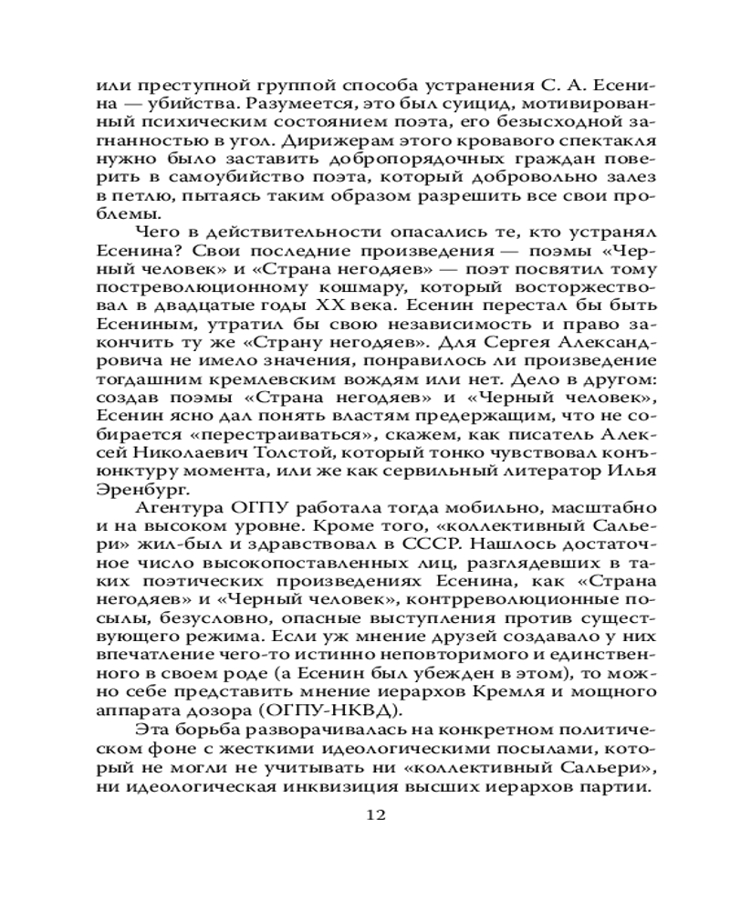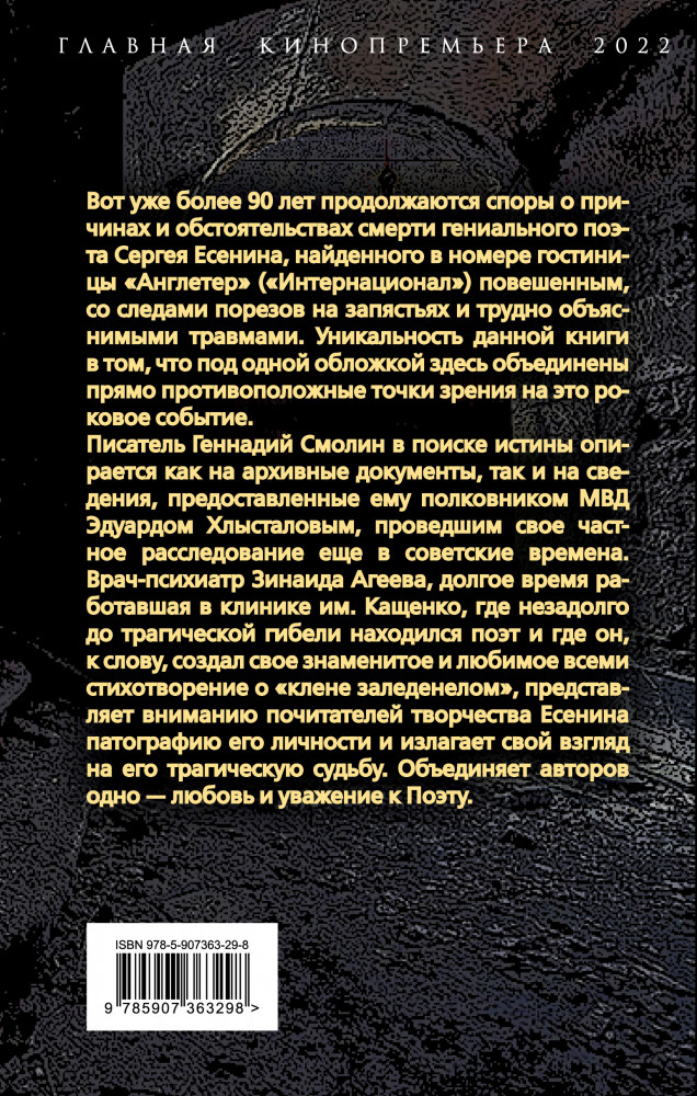 Тайна гибели Сергея Есенина. Дожить до декабряЗинаида Михайловна Агеева, Геннадий Александрович Смолин В данный момент этот товар отсутствует в продаже. Возможно, у нас найдется аналогичный или похожий товар здесь. Серия: Главная кинопремьера года Вот уже более 90 лет продолжаются споры о причинах и обстоятельствах смерти гениального поэта Сергея Есенина, найденного в номере гостиницы «Англетер» («Интернационал») повешенным, со следами порезов на запястьях и трудно объяснимыми травмами. Уникальность данной книги в том, что под одной обложкой здесь объединены прямо противоположные точки зрения на это роковое событие. |