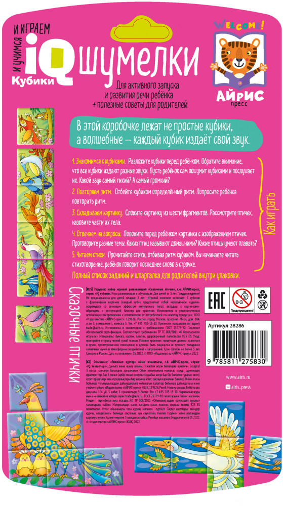 💳 Оплатить за товар можно при получении 🇰🇿 Есть бесплатная доставка по Казахстану 🎁 Копите бонусы с каждой покупки Серия: IQ Кубики Набор состоит из 6 кубиков, из которых можно сложить 6 картинок с изображением сказочных птиц. Особенность кубиков в том, что картинки складываются в форме не только привычного прямоугольника, но и других фигур. Благодаря различным наполнителям каждый кубик издаёт свой звук. Ребёнок учится различать звуки, их громкость, отбивать ритм, слушает ритмические стихи. В процессе игры развиваются фонематический слух, активная речь, мышление, умение работать по образцу, происходит знакомство с понятиями «часть и целое». Наклейки на кубики сделаны из качественной гладкой бумаги, которая не портится от игры. |