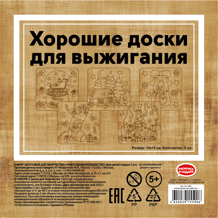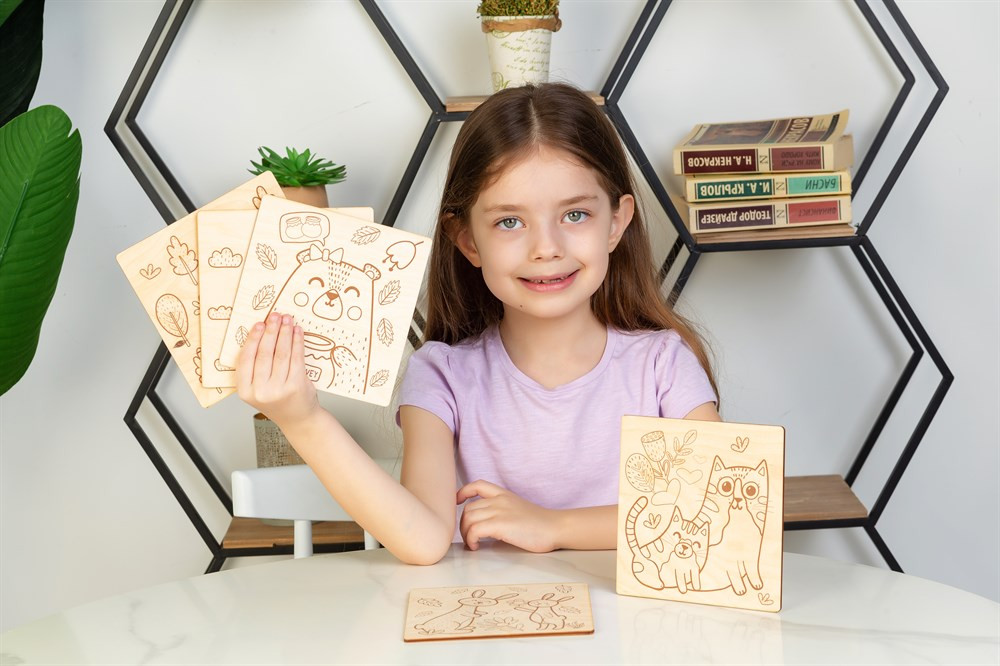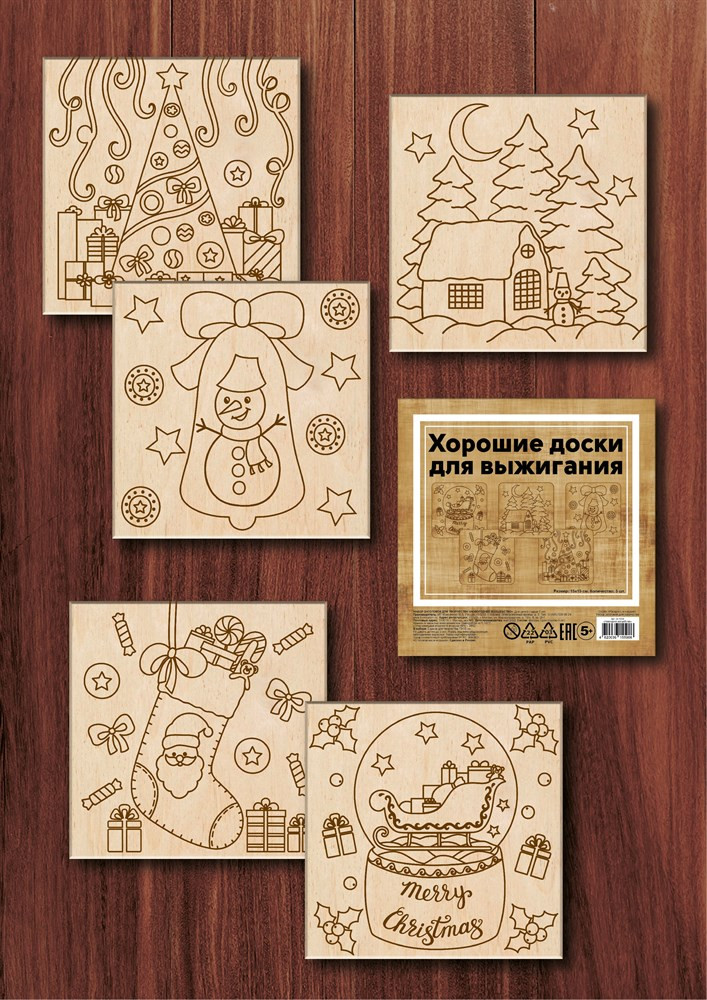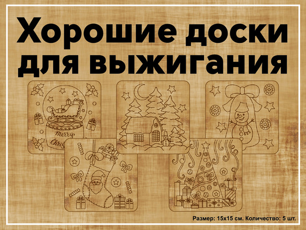 Набор из 5 деревянных заготовок подойдет для выжигания или раскрашивания. На каждую из досок нанесены контурные изображения. Доски выполнены из качественной березовой фанеры. Поверхность отлично отшлифована, ровная, без шероховатостей и зазубрин. Картинки можно не выжигать, а просто раскрасить любыми красками.