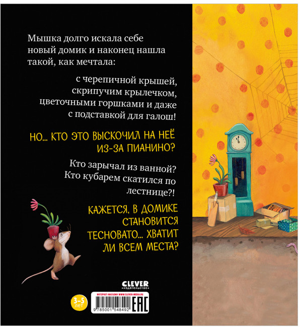 Всем хватит места!В данный момент этот товар отсутствует в продаже. Возможно, у нас найдется аналогичный или похожий товар здесь. Серия: Книжки-картинки Мышка долго искала себе новый домик и наконец нашла такой, как мечтала: с черепичной крышей, скрипучим крылечком, цветочными горшками и даже с подставкой для галош! Но… Кто это выскочил на неё из-за пианино? Кто зарычал из ванной? Кто кубарем скатился по лестнице?! Кажется, в домике становится тесновато... хватит ли всем места? |
