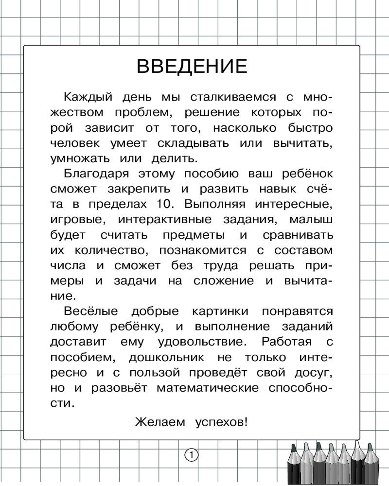 Благодаря этому пособию ребёнок сможет закрепить и развить навык Счёта в пределах 10. Выполняя интересные, игровые, интерактивные задания, малыш будет считать предметы и сравнивать их количество, познакомится с составом числа и сможет без труда решать примеры и задачи на сложение и вычитание. Весёлые добрые картинки понравятся любому ребёнку, и выполнение заданий доставит ему удовольствие.