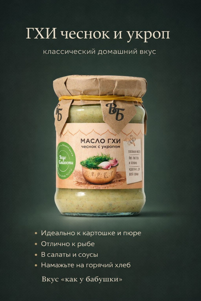Вкус благости Масло топленое с чесноком и укропом «Гхи»+39 вкус аромат для жарки качество универсальность