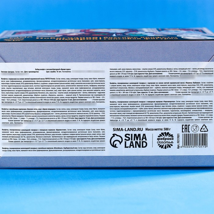 Конфеты «Буревестник»: сахар, шоколадная глазурь (сахар, какао тёртое, эквивалент масла какао (рафинированные, дезодорированные, фракционированные, негидрогенизированные растительные масла (пальмовые, ши)), какао-порошок, эмульгаторы – лецитин соевый, Е476, ароматизатор «Ваниль»), вода питьевая, сгущённое с сахаром молоко (цельное молоко, сахар), патока, спирт этиловый ректификованный (0,9%), ароматизатор «Ванильно-сливочный».