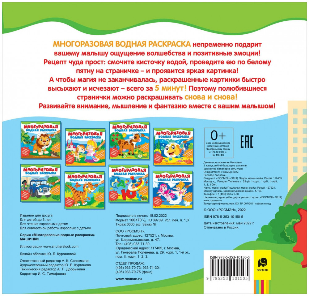 Серия: Многоразовые водные раскраски Многоразовая водная раскраска непременно подарит вашему малышу ощущение волшебства и позитивные эмоции! Рецепт чуда прост: смочите кисточку водой, проведите ею по белому пятну на страничке — и проявится яркая картинка! А чтобы магия не заканчивалась, раскрашенные картинки быстро высыхают и исчезают — всего за 5 минут! Поэтому полюбившиеся странички можно раскрашивать снова и снова! Развивайте внимание, мышление и фантазию вместе с вашим малышом! |