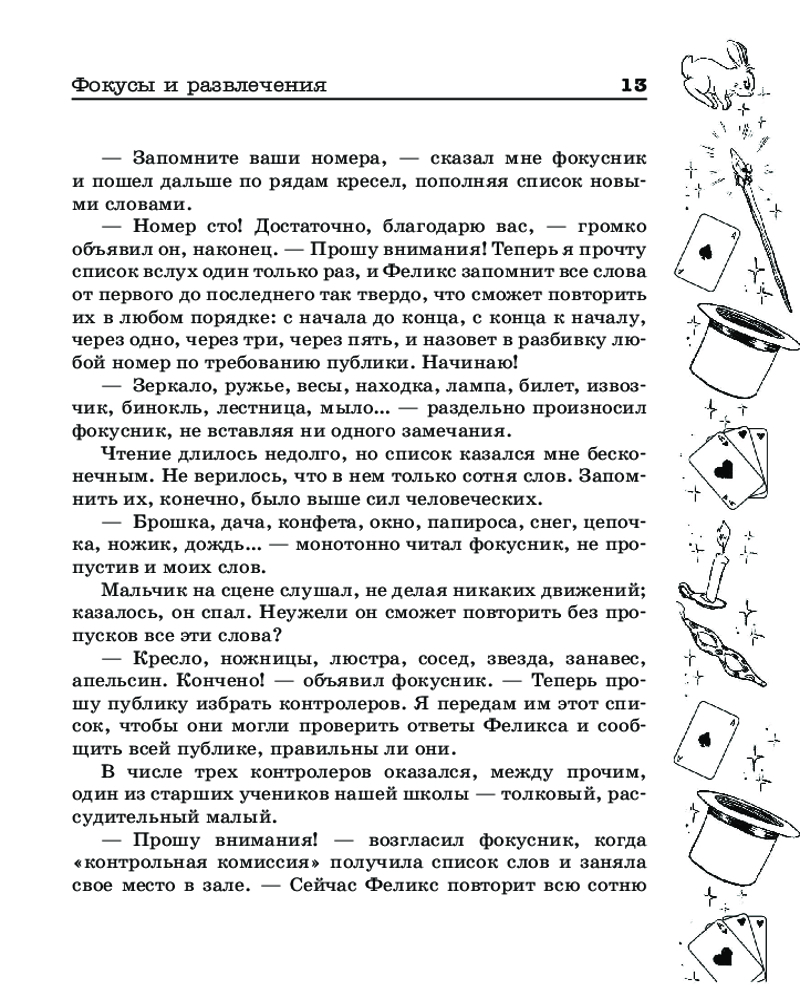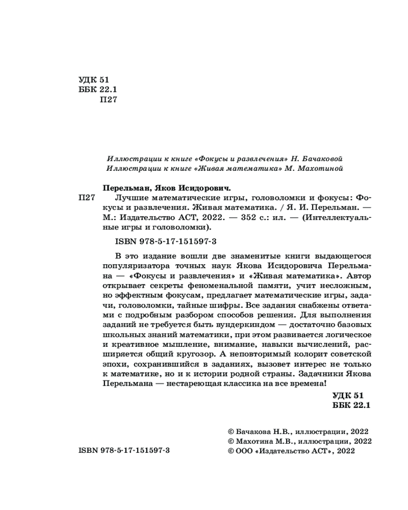 Лучшие математические игры, головоломки и фокусыВ данный момент этот товар отсутствует в продаже. Возможно, у нас найдется аналогичный или похожий товар здесь. Серия: Интеллектуальные игры и головоломки В это издание вошли две знаменитые книги выдающегося популяризатора точных наук Якова Исидоровича Перельмана — «Фокусы и развлечения» и «Живая математика». Автор открывает секреты феноменальной памяти, учит несложным, но эффектным фокусам, предлагает математические игры, задачи, головоломки, тайные шифры. Все 250 заданий снабжены ответами с подробным разбором способов решения. Для выполнения заданий не требуется быть вундеркиндом — достаточно базовых школьных знаний математики, при этом развивается логическое и креативное мышление, внимание, навыки вычислений, расширяется общий кругозор. А неповторимый колорит советской эпохи, сохранившийся в заданиях, вызовет интерес не только к математике, но и к истории родной страны. Задачники Якова Перельмана — нестареющая классика на все времена! |