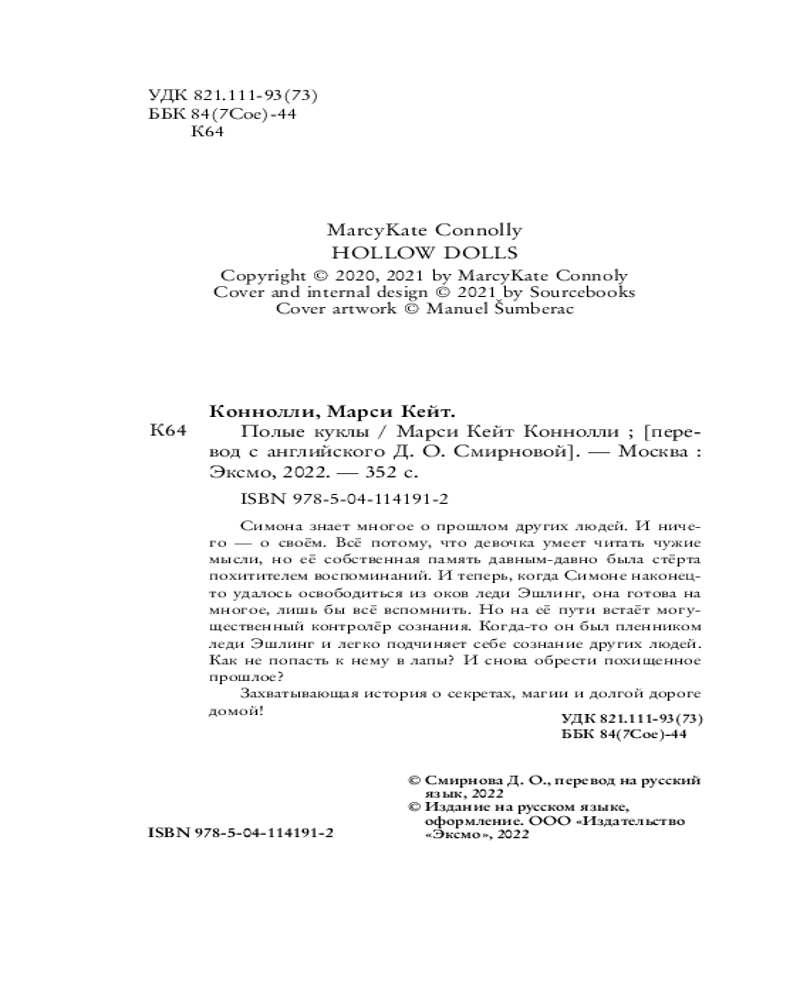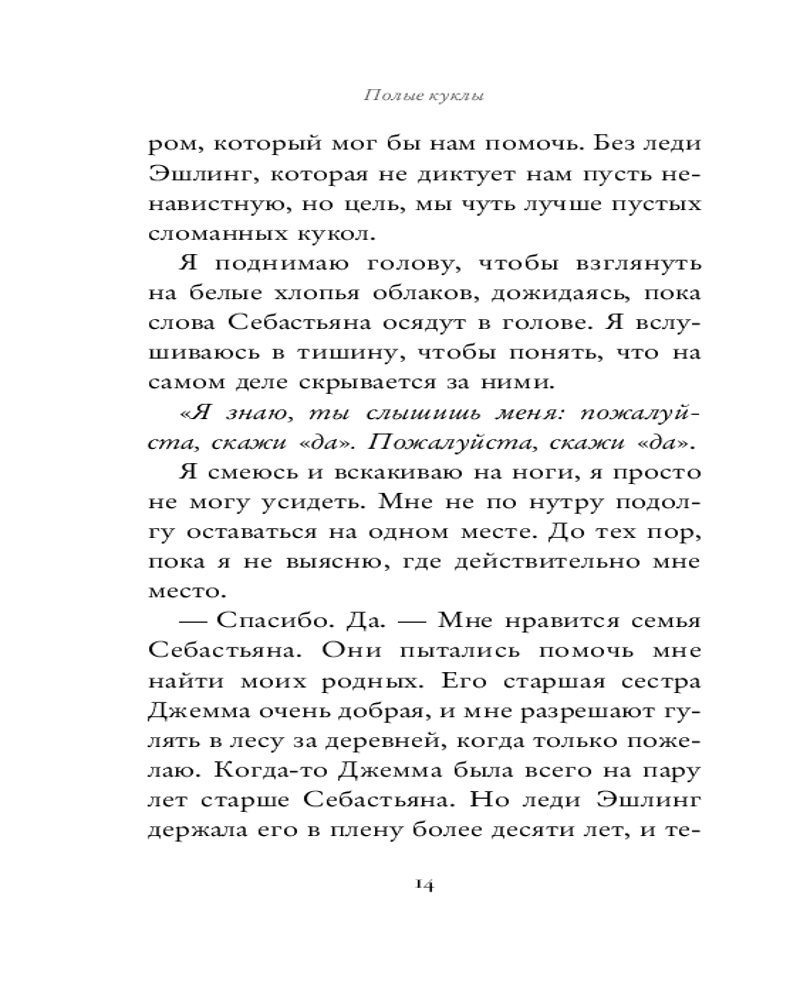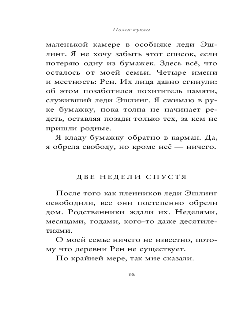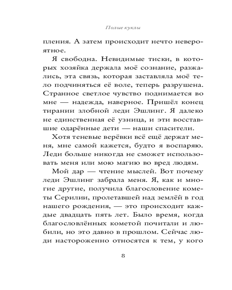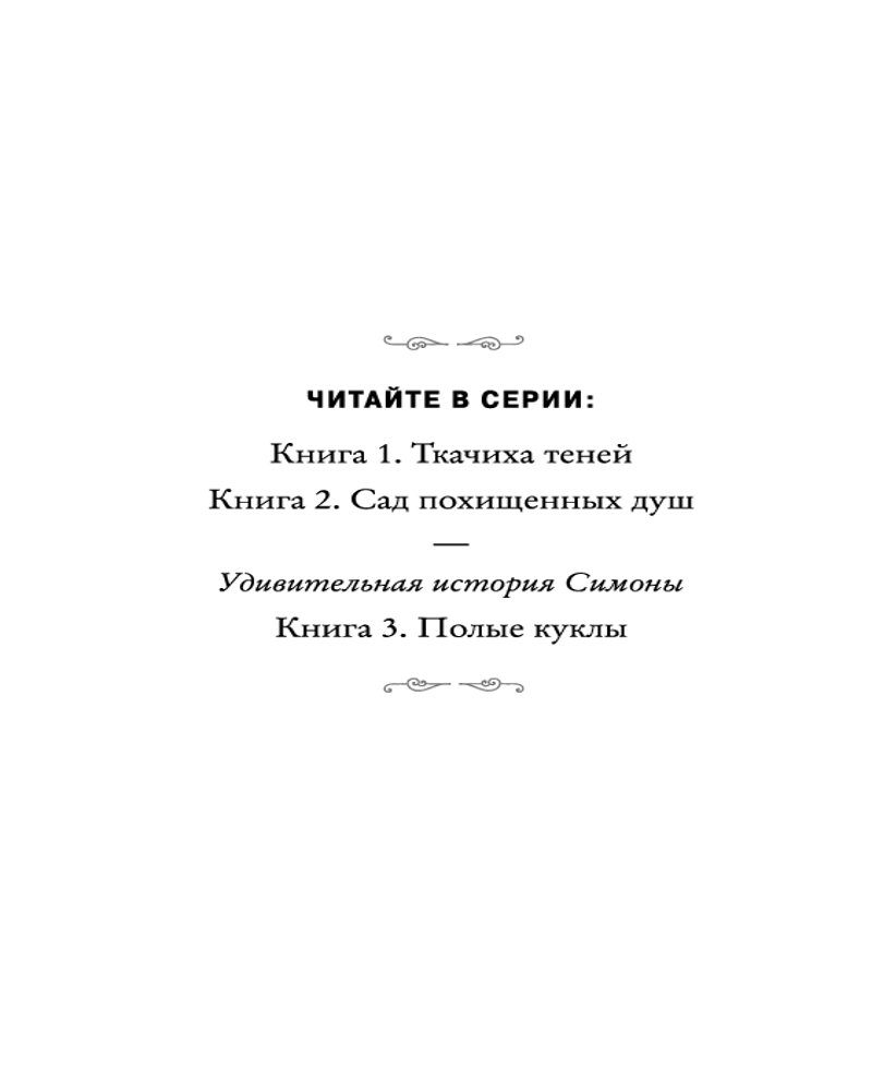 Полые куклыВ данный момент этот товар отсутствует в продаже. Возможно, у нас найдется аналогичный или похожий товар здесь. Серия: Детск. Ткачиха теней Симона знает многое о прошлом других людей. И легко узнаёт секреты всех, кого встречает на пути. Всё потому, что у девочки есть необычный дар: она умеет читать чужие мысли. Но память самой Симоны стёр похититель памяти, и её история вот уже десятки лет остаётся загадкой. И однажды она решает отправиться в странствие, чтобы наконец узнать, кем была раньше. Но получится ли у Симоны обрести похищенное прошлое?  |