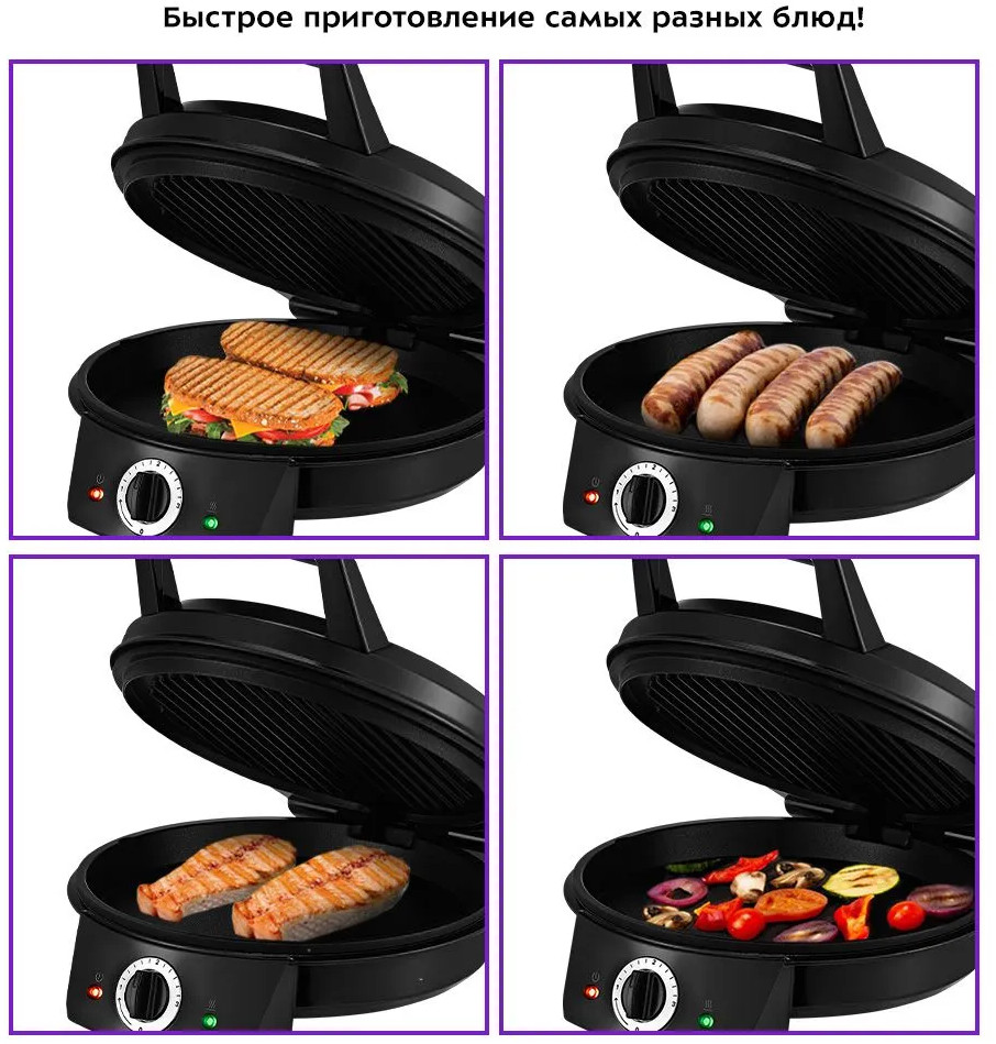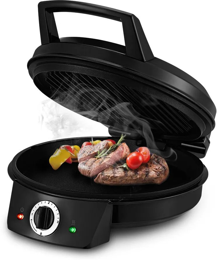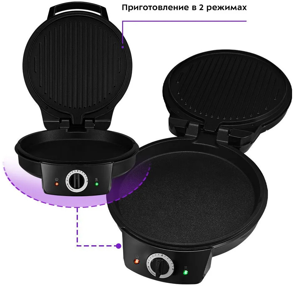 Конструкция гриля позволяет готовить в 2 режимах. В двустороннем режиме гриль закрывается крышкой и продукты готовятся одновременно в 2 сторон. В одностороннем крышка откидывается на 180 °С, и гриль превращается в большую жаровню.