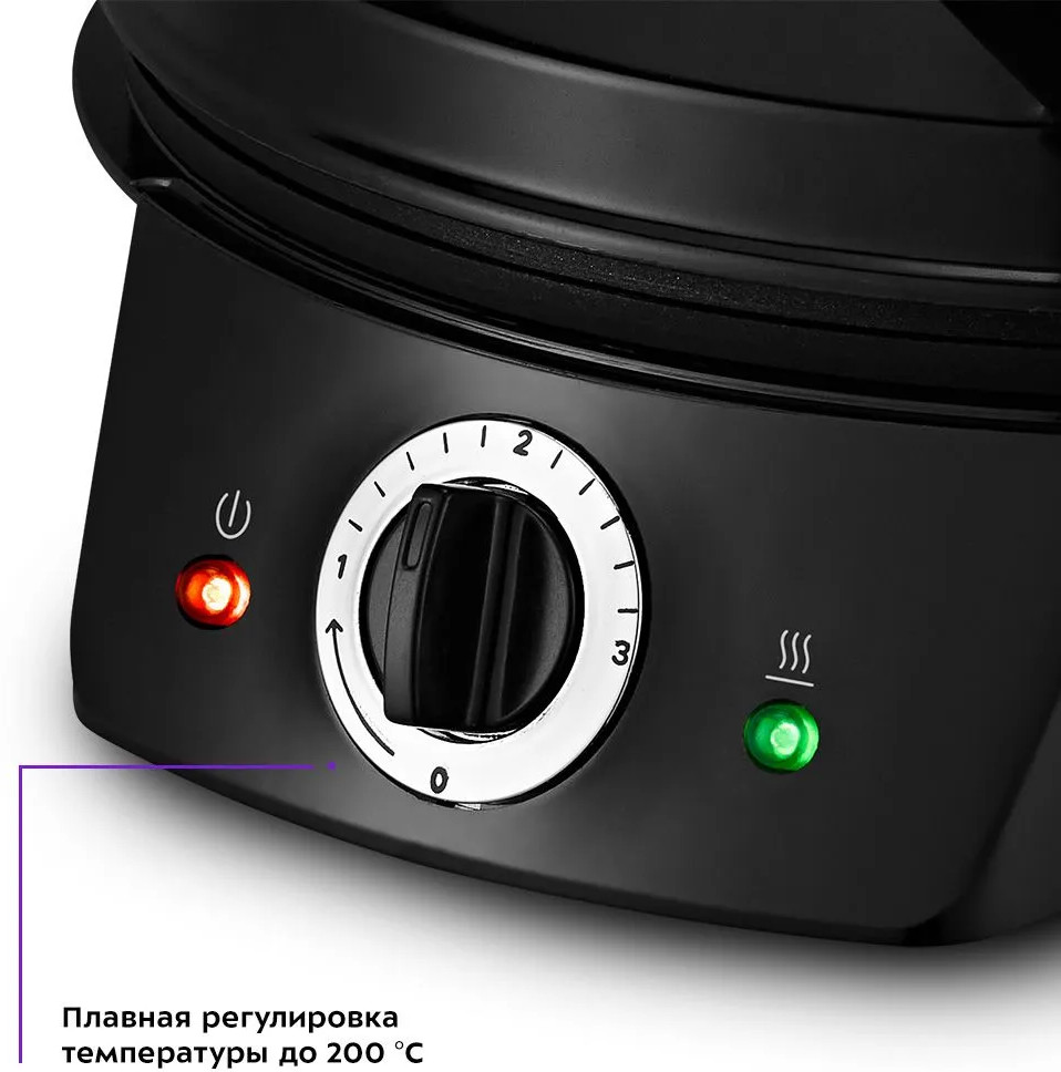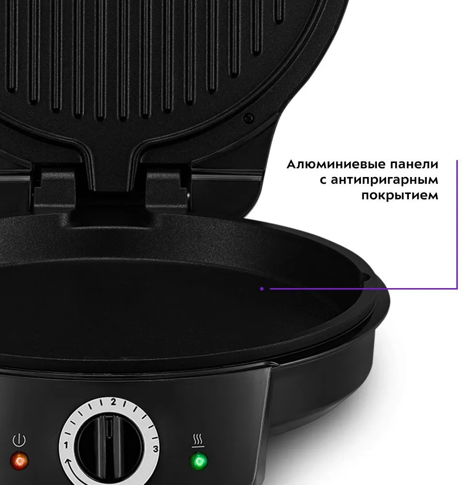 Регулятор температуры является ручкой термостата. Термостат обеспечивает возможность плавно регулировать температуру и поддерживать её в процессе приготовления. Индикаторы отображают нагрев панелей и включенное состояние прибора.