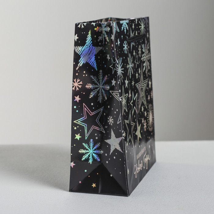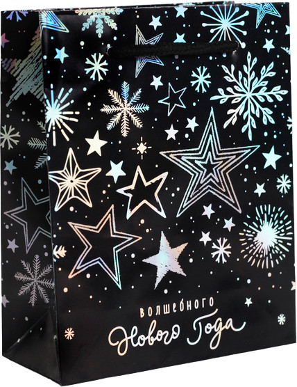 пакетик очень красивый, снежинки и звезды на чёрном фоне красиво переливаются всеми цветами радуги, пакет достаточно прочный, есть дно, для небольших вещей самое то