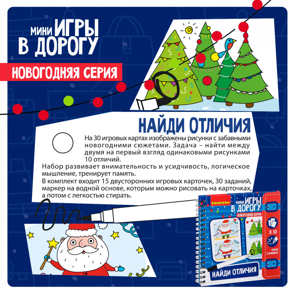Bondibon Мини-игры в дорогу «Найди отличия»В данный момент этот товар отсутствует в продаже. Возможно, у нас найдется аналогичный или похожий товар здесь. Серия: Мини-игры в дорогу Мини-игры в дорогу «Найди отличия!» Новогодней серии от Bondibon — это занимательная игра для детей различного возраста. На 30 игровых картах изображены рисунки с различными новогодними сюжетами. Игроку нужно определить, чем различаются эти на первый взгляд одинаковые картинки, найти отличия. Все страницы выполнены из ламинированного картона, что позволяет использовать игру многократно, а также соревноваться с друзьями. В комплект входит маркер на водной основе. Забудьте о скучных путешествиях вместе с замечательными мини-играми в дорогу от Bondibon! Красочные и компактные, они будет идеальными спутниками для маленького непоседы. Очень важно развивать у малыша внимание, усидчивость и логику. А лучше делать все это во время увлекательной игры, которая никогда не надоедает! |
