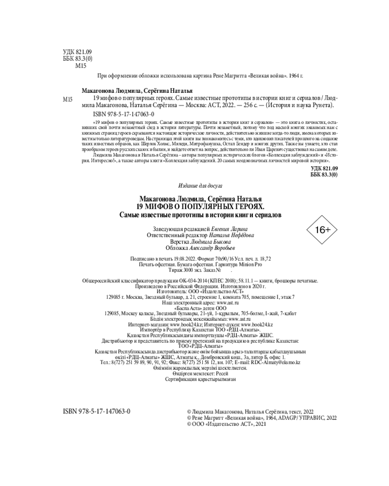 Серия: История и наука Рунета «19 мифов о популярных героях. Самые известные прототипы в истории книг и сериалов» — это книга о личностях, оставивших свой почти незаметный след в истории культуры. Почти незаметный, потому что под маской многих знакомых нам по книгам и фильмам героев скрываются настоящие исторические личности, действительно жившие когда-то люди, имена которых известны только историкам, литературоведам и кинокритикам. На страницах этой книги вы познакомитесь с теми, кто вдохновил писателей и режиссеров прошлого на создание таких известных образов, как Шерлок Холмс, Хюррем, Миледи, Митрофанушка, Остап Бендер и многих других. Также вы узнаете, кто стал прообразом героев русских сказок и былин, и найдете ответ на вопрос, действительно ли Иван Царевич существовал на самом деле. |