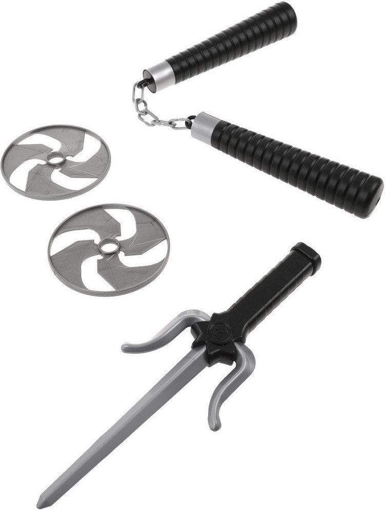 длина нунчаков — 18 см, кинжала — 27 см, диаметр сюрикена — 10 см