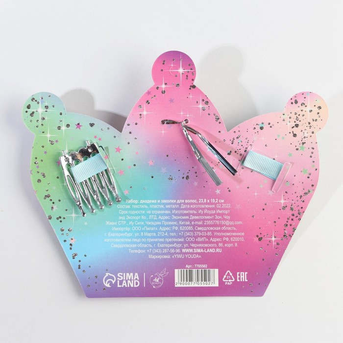 Подарочный новогодний набор для маленькой принцессы. Такой набор аксессуаров для волос украсят прическу вашего ребенка на утреннике в детском саду или школе. Заколки клик-клак выполнены в форме корон, которые изготовлены из текстиля и хорошо держат волосы, не повреждая их, а корона, благодаря миниатюрности размера, не утяжеляет прическу и не давит на волосы, при этом хорошо крепится к ним. Набор заколок для волос надежно упакован в подарочную подложку с эксклюзивным дизайном, что позволяет использовать подарочный набор как дополнение к новогоднему подарку дочери, сестре, подруге, племяннице.