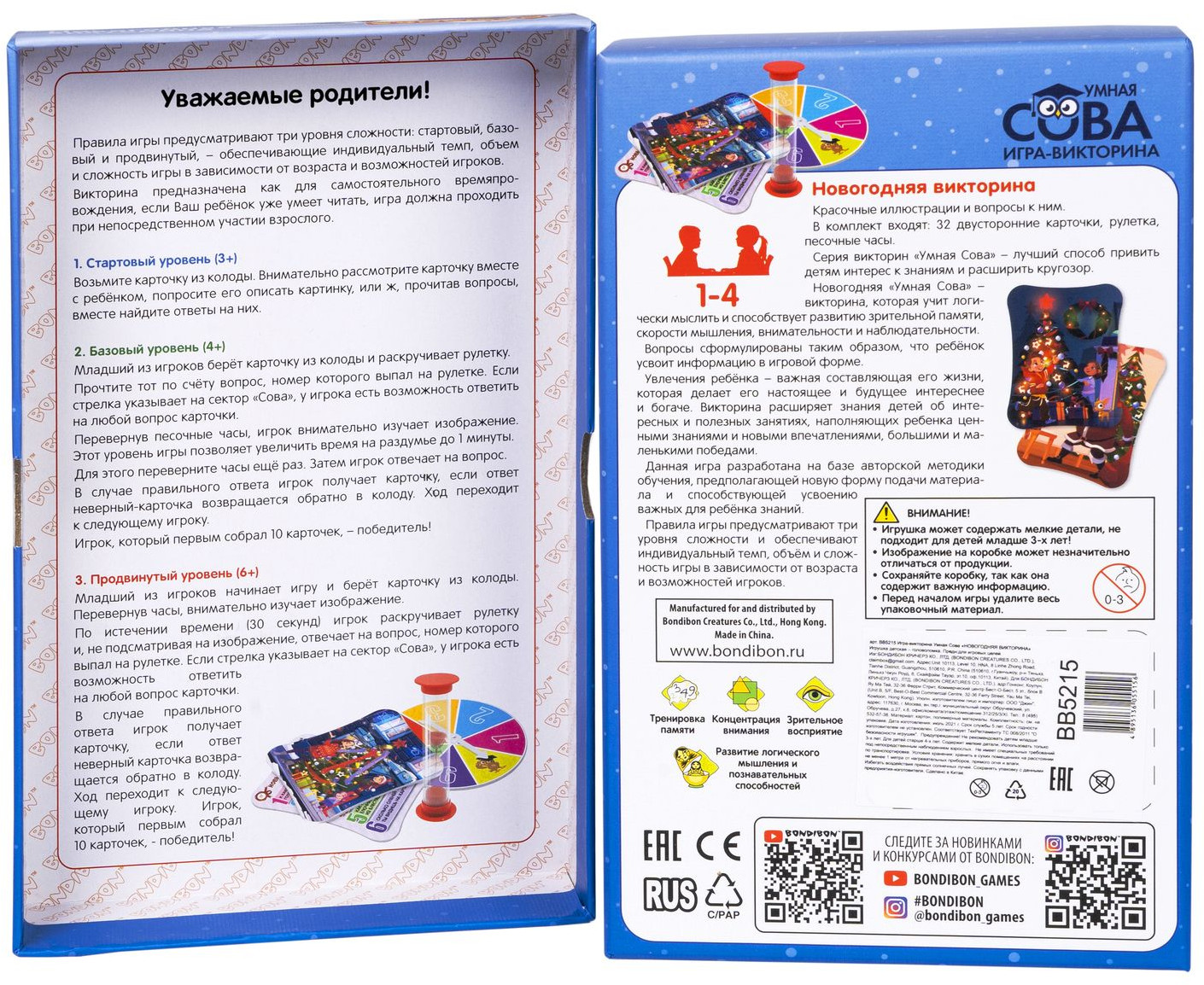 Bondibon Игра-викторина «Умная сова»В данный момент этот товар отсутствует в продаже. Возможно, у нас найдется аналогичный или похожий товар здесь. Серия: Новогодняя викторина Новогодняя «Умная Сова» — викторина, которая учит логически мыслить и способствует развитию зрительной памяти, скорости мышления, внимательности и наблюдательности. Вопросы сформулированы таким образом, что ребёнок усвоит информацию в игровой форме. |