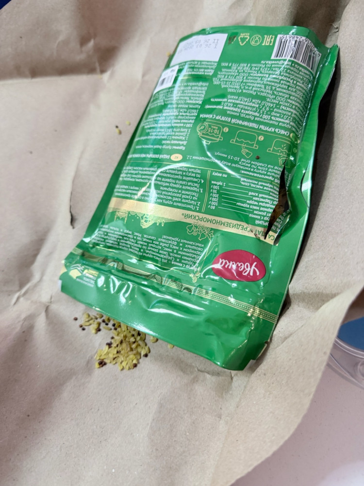 Пришел без брака. Я заказала, когда еще не знала что он с глютеном, так сто кушал муж. Ему не понравилось, может не привык к заморскому питанию😂😂😂