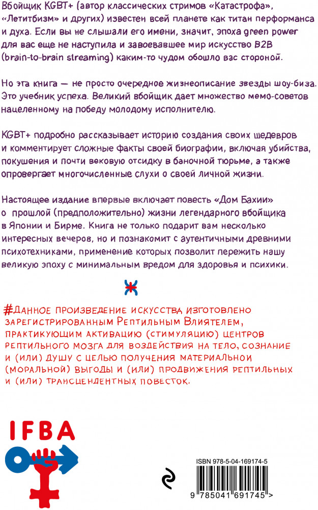 Но эта книга — не просто очередное жизнеописание звезды шоу-биза. Это учебник успеха. Великий вбойщик дает множество мемо-советов нацеленному на победу молодому исполнителю. KGBT+ подробно рассказывает историю создания своих шедевров и комментирует сложные факты своей биографии, включая убийства, покушения и почти вековую отсидку в баночной тюрьме, а также опровергает многочисленные слухи о своей личной жизни. Настоящее издание впервые включает повесть «Дом Бахии» о прошлой (предположительно) жизни легендарного вбойщика в Японии и Бирме.