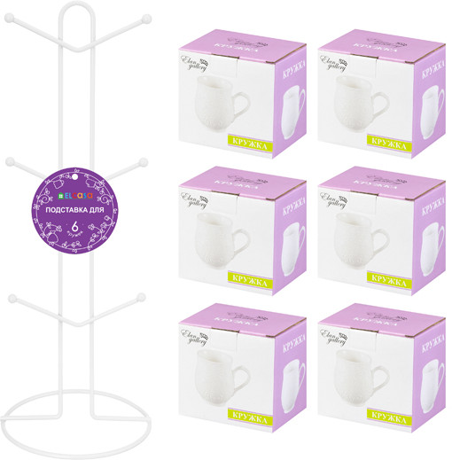 Набор серии «Розы» состоит из шести кружек по 350 мл на металлической подставке. Набор кружек поможет провести множество приятных завтраков с капучино или латте, а также уютных чайных вечеров. Кружки выполнены из высококачественного белого фарфора и украшены декоративными рельефными узорами. Фарфоровые чашки отличаются от керамических повышенной плотностью. Они не впитывают цвет кофе, чая, глинтвейна, других горячих напитков и не деформируются от влаги, чему может быть подвержена керамика. Кружки можно использовать в СВЧ и ПММ.