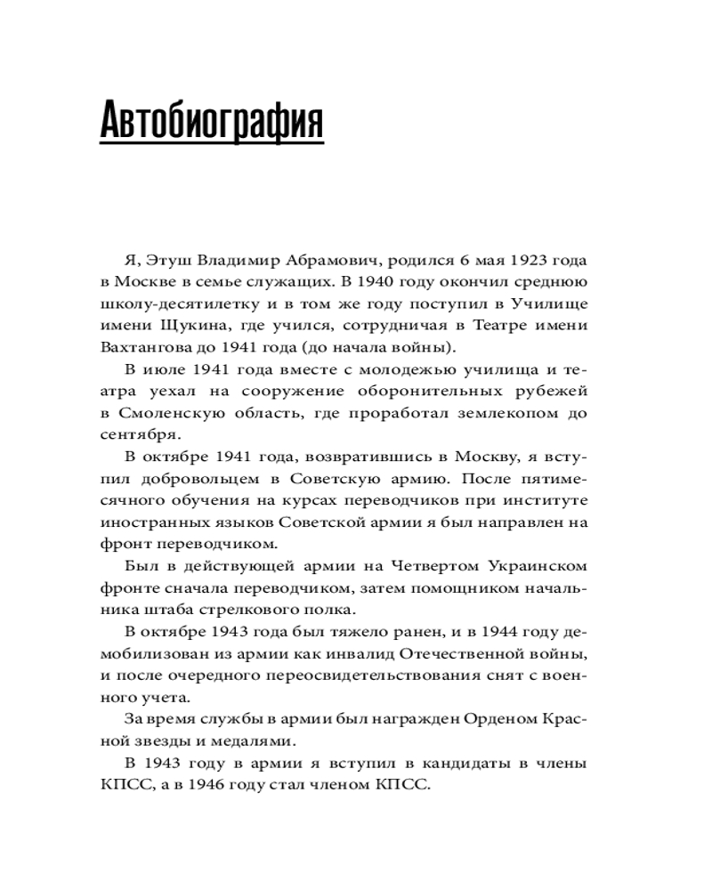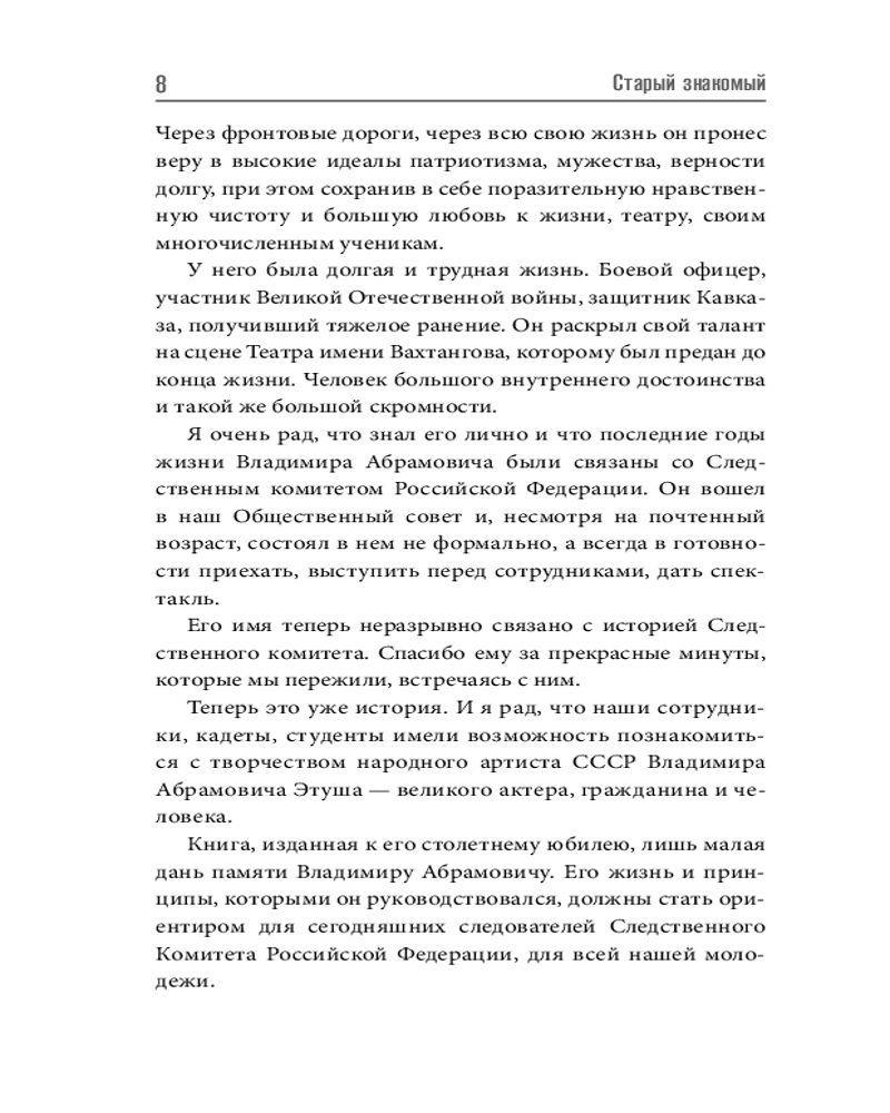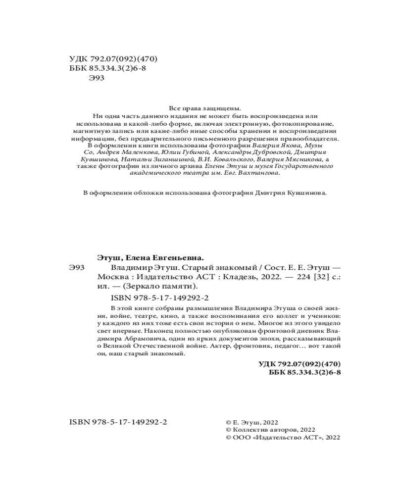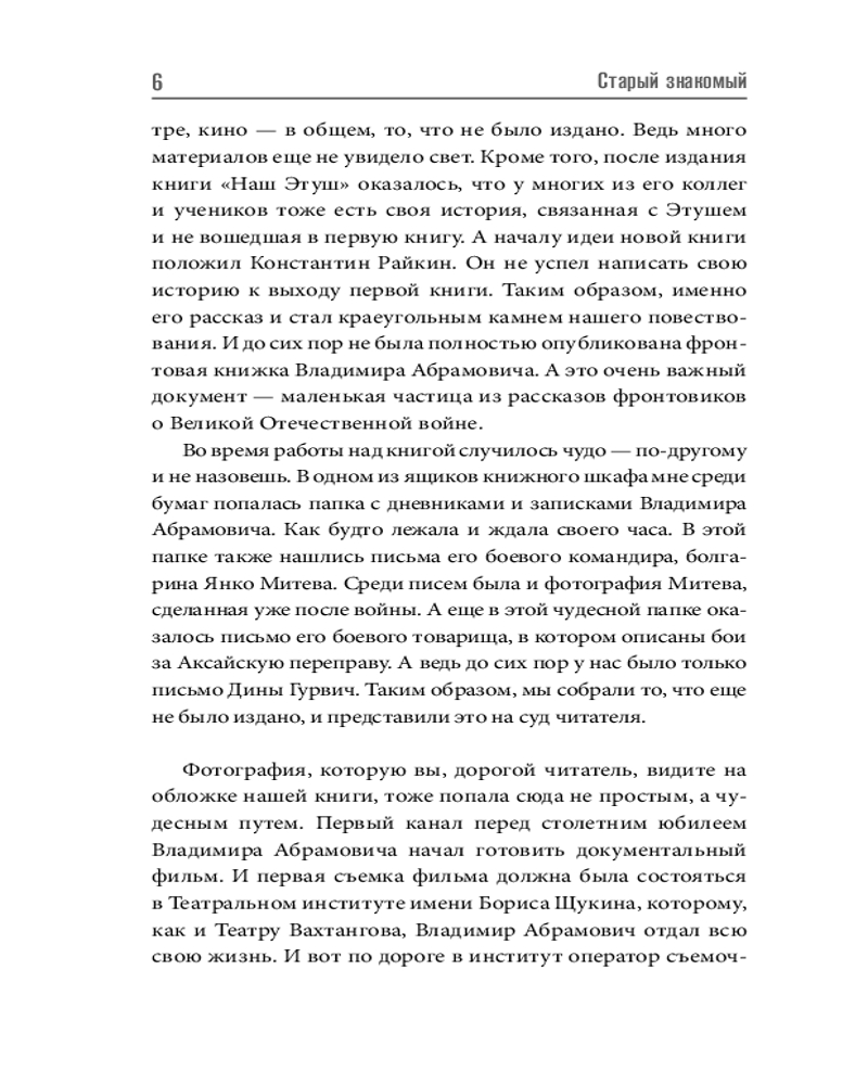 Владимир Этуш. Старый знакомыйВ данный момент этот товар отсутствует в продаже. Возможно, у нас найдется аналогичный или похожий товар здесь. Серия: Зеркало памяти В этой книге собраны размышления Владимира Этуша о своей жизни, войне, театре, кино, а также воспоминания его коллег и учеников: у каждого из них тоже есть своя история о нем. Многое из этого увидело свет впервые. Наконец полностью опубликован фронтовой дневник Владимира Абрамовича, один из ярких документов эпохи, рассказывающий о Великой Отечественной войне. Актер, фронтовик, педагог... вот такой он, наш старый знакомый. |