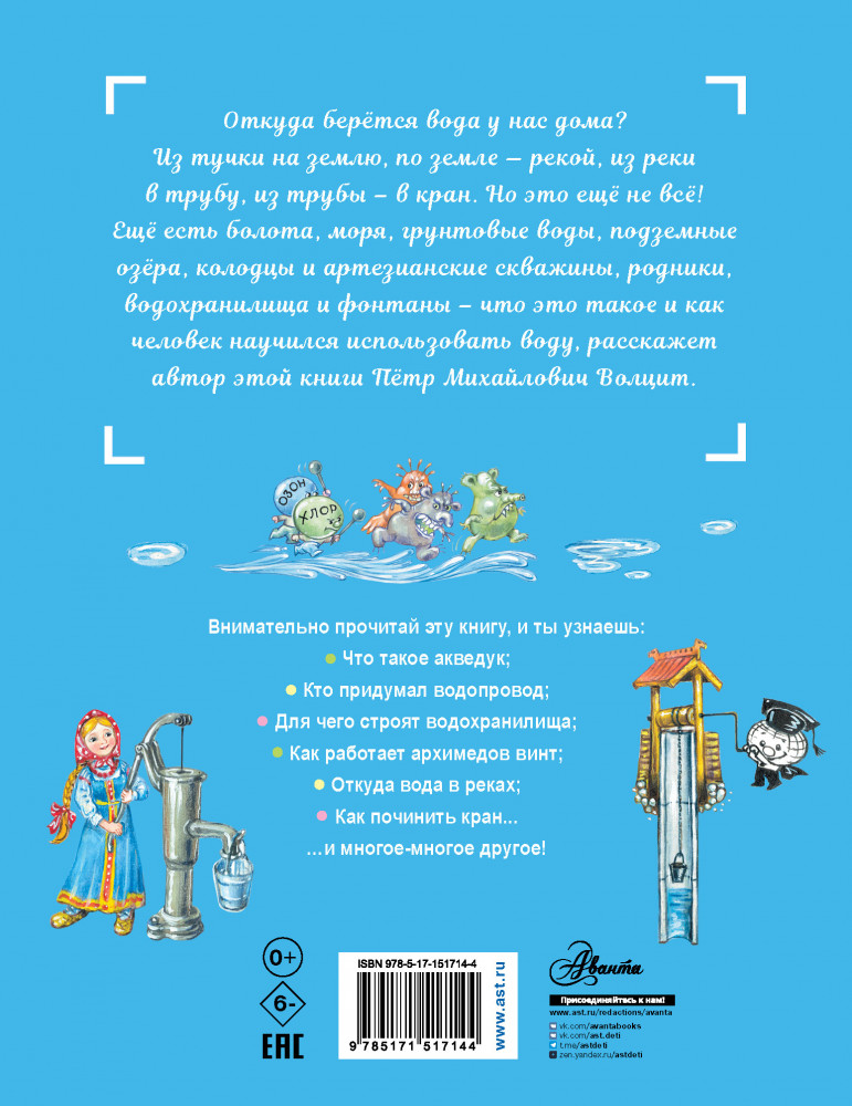 Серия: Самые лучшие почемучкины книжки Откуда берётся вода у нас дома? Из тучки на землю, по земле — рекой, из реки в трубу, из трубы — в кран. Но это ещё не всё! Ещё есть болота, моря, грунтовые воды, подземные озёра, колодцы и артезианские скважины, родники, водохранилища и фонтаны — что это такое и как человек научился использовать воду, расскажет автор этой книги Пётр Михайлович Волцит. |