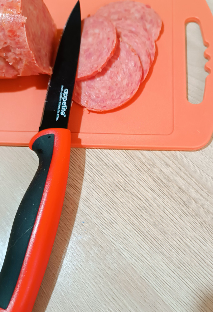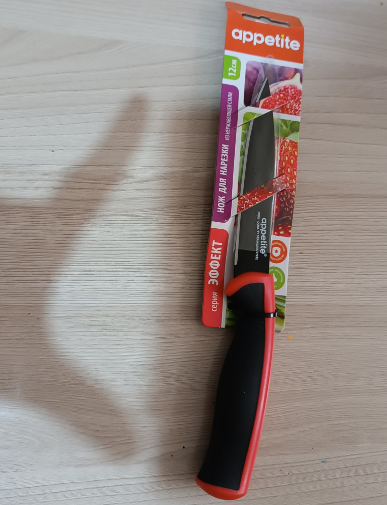 Хороший, небольшой, острый нож. Очень удобная ручка. Не дорогой, тем более,что купила со скидкой. Сразу же попробовала нарезать колбасу, идёт, как по маслу, тоненькие получаются пластики.