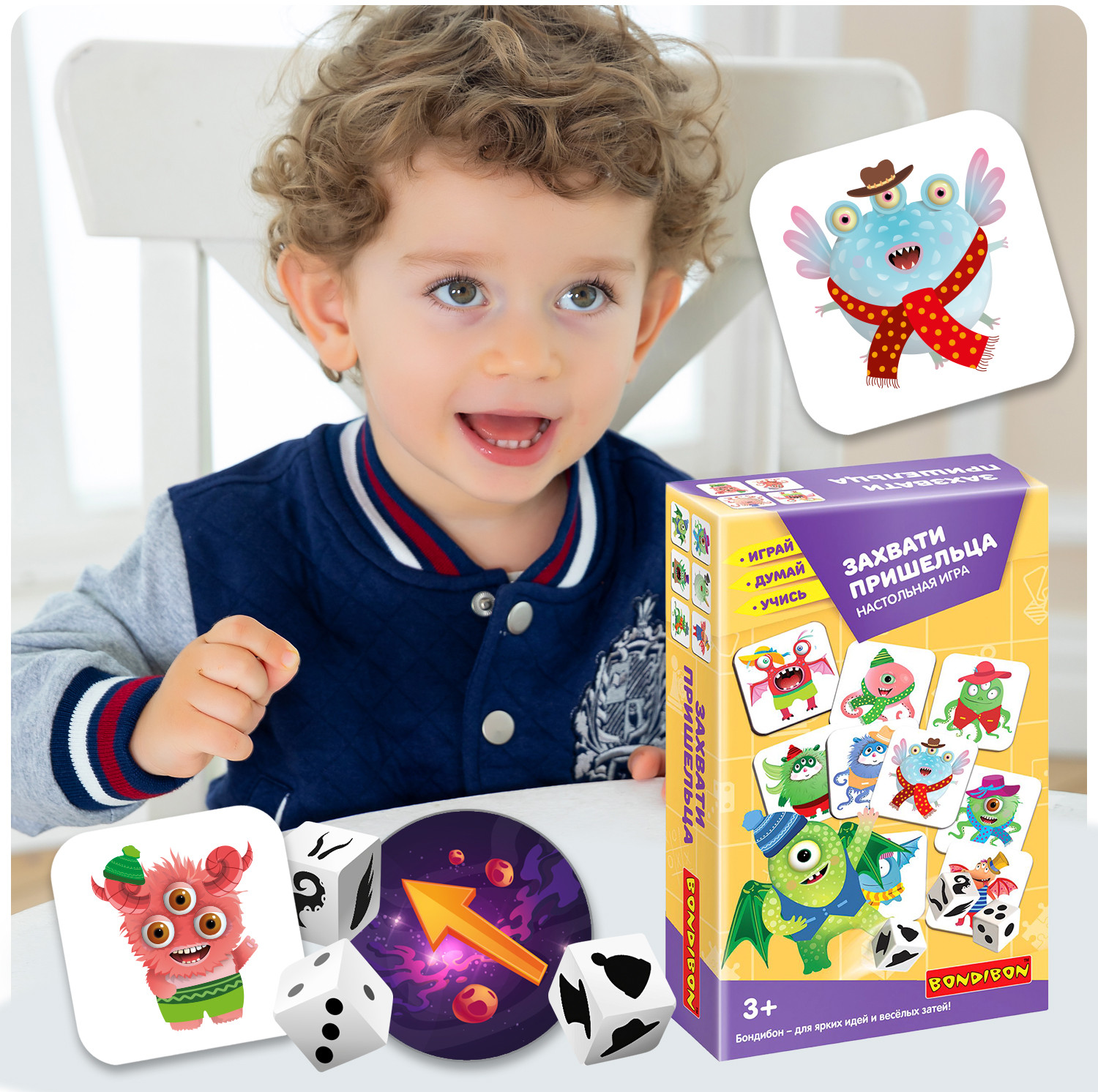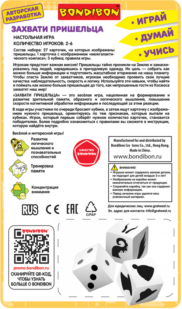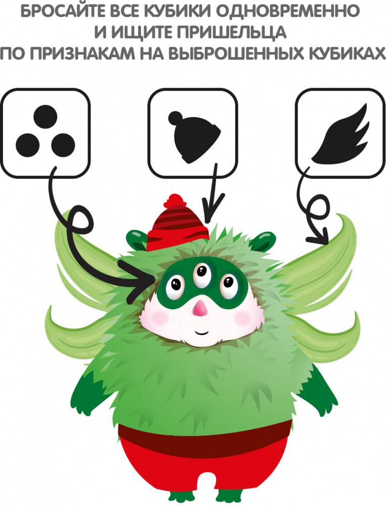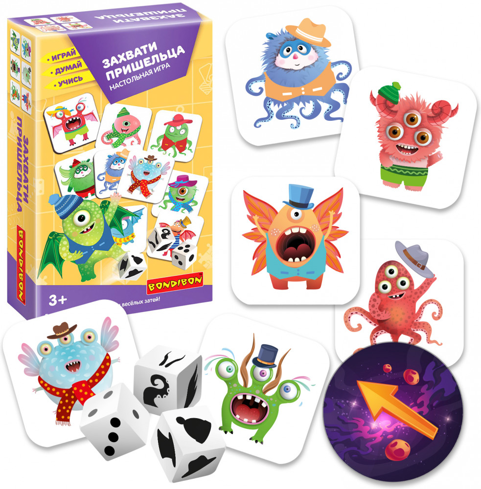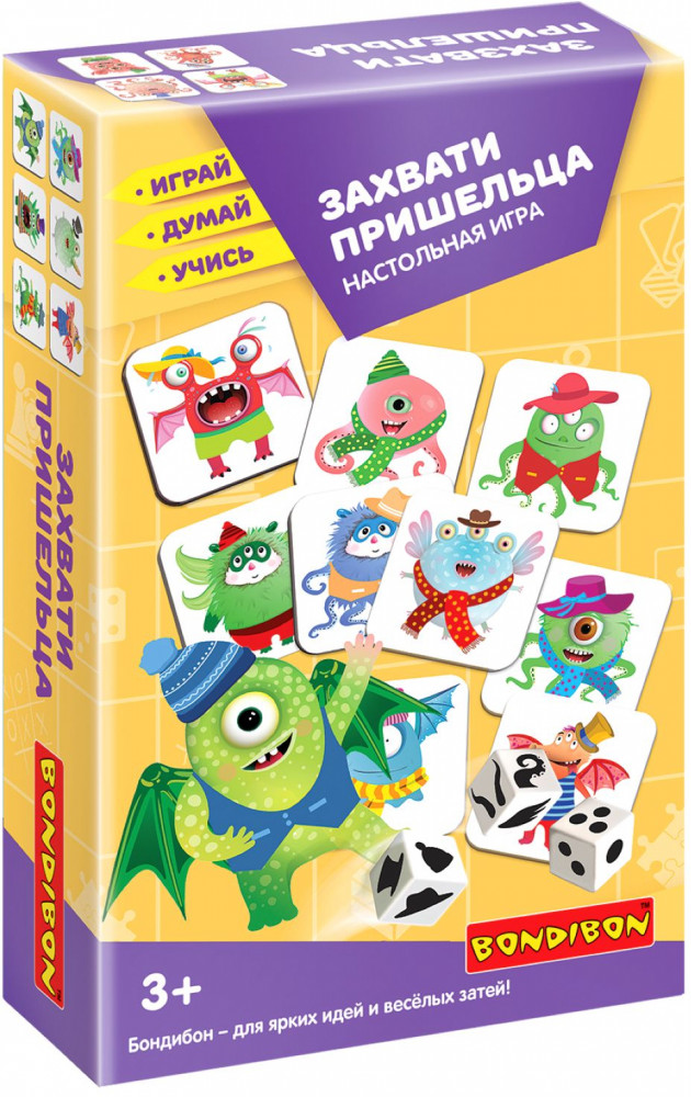 Серия: Играй. Думай. Учись Над планетой Земля нависла угроза вторжения пришельцев. Чтобы защитить планету от незваных гостей, необходимо их рассекретить. «Захвати пришельца» — это весёлая игра Bondibon на внимательность. Развивает зрительную память, учит ребёнка внимательно рассматривать предметы и быстрее всех находить изображение в соответствии с признаками на выпавших кубиках. |