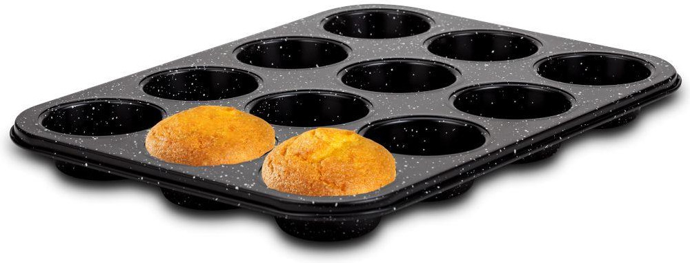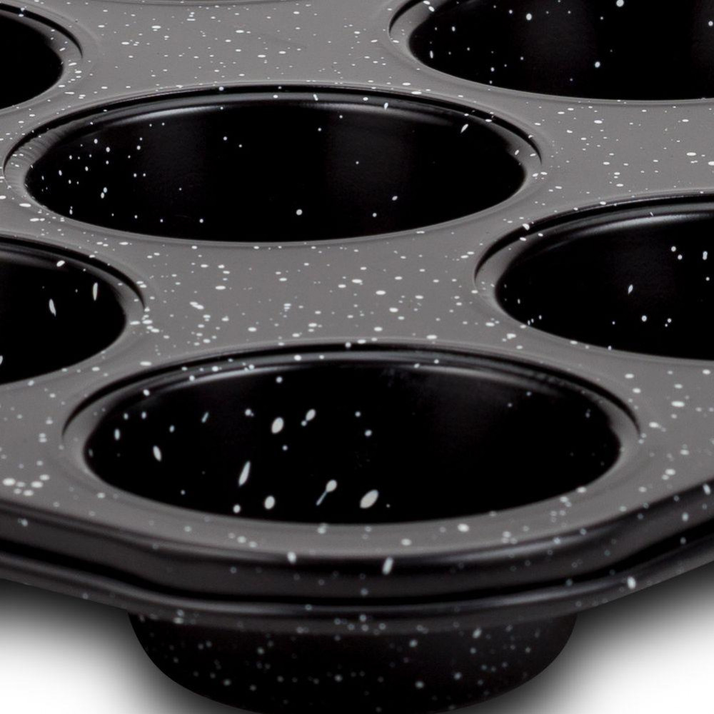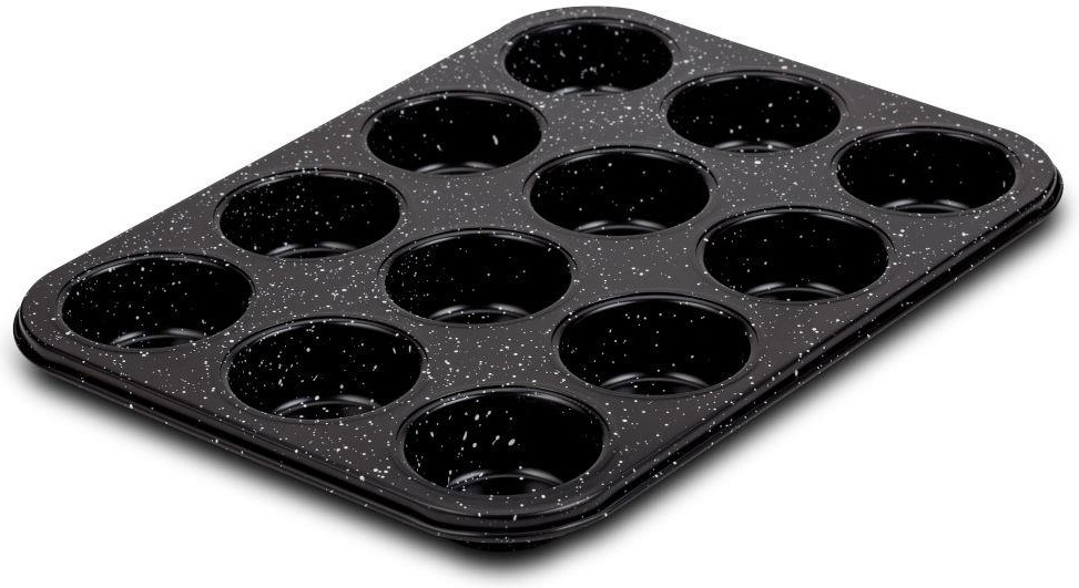 Прямоугольный стальной противень с антипригарным покрытием для маффинов. Практичная посуда, которая позволяет одновременно готовить до 12 маффинов, бисквитных тортов или капкейков. Он изготовлен из стали, которая обеспечивает равномерное распределение тепла в посуде для достижения наилучших результатов. Антипригарное каменное покрытие обеспечивает легкое извлечение маффинов из формы, не повреждая их, а также легкую очистку формы после использования.
