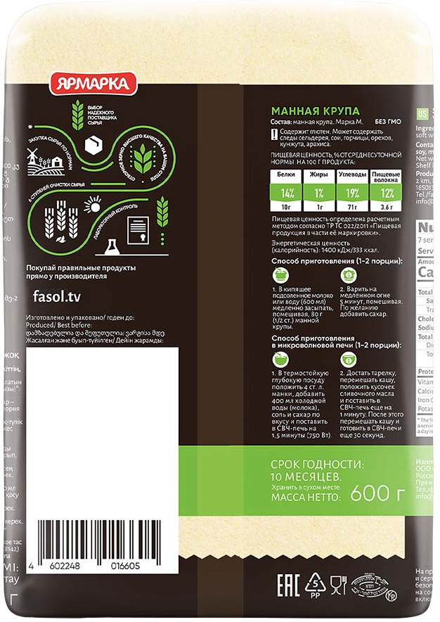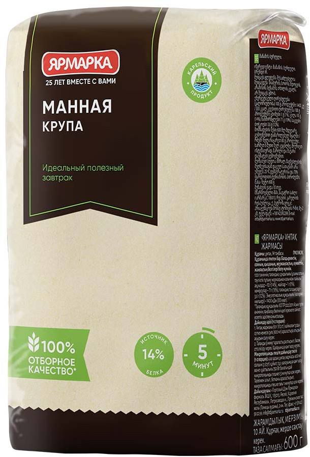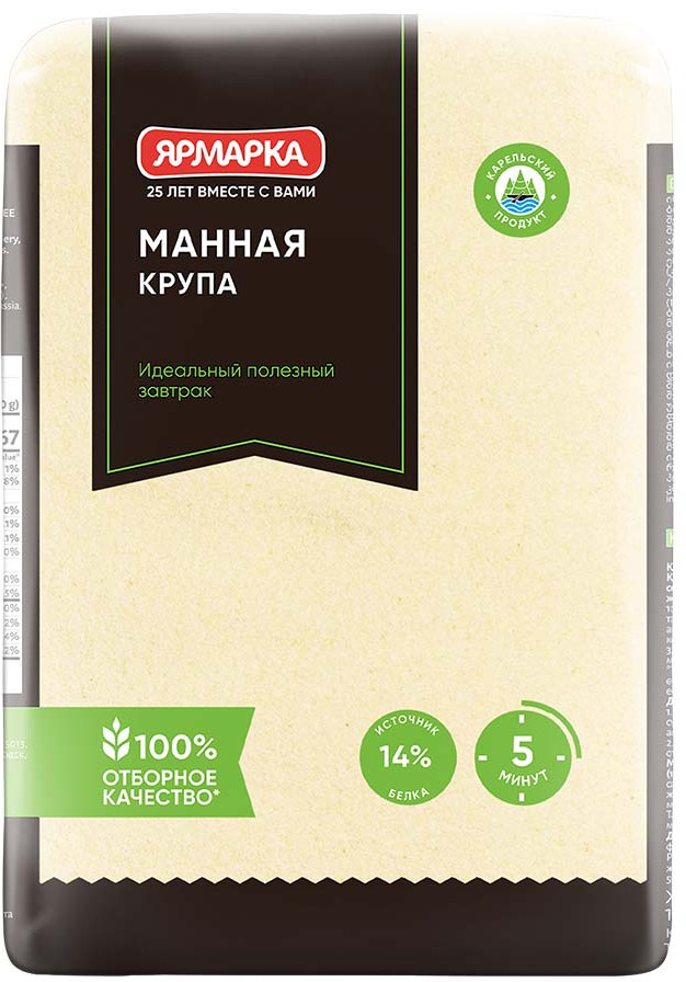 Манная крупа марки «Ярмарка» производится на современном оборудовании из мягких сортов отборной пшеницы. Грубая оболочка зерна удаляется при переработке, остаётся только измельченная питательная сердцевина. Манка используется в детском и диетическом питании, идеальна для приготовления каш. Благодаря высокому содержанию растительного белка и крахмала, она очень питательна и легко усваивается. Пожалуй, нет ни одного человека, кто хоть раз в жизни не пробовал бы манной каши. Её вкус знаком каждому с детства. Уникальное свойство каши из манной крупы очищать кишечник от слизи и лишнего жира делает её незаменимой в питании людей с заболеваниями желудочно-кишечного тракта. Содержащиеся в ней калий, фосфор и железо необходимы для работы нервной системы, костей и суставов. В манке мало клетчатки, но зато она быстро готовится, и каша из нее получается необычайно нежной!