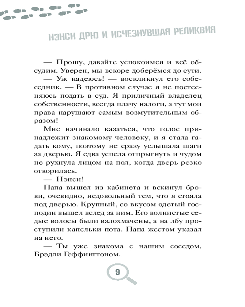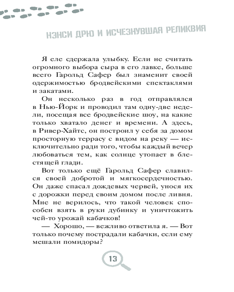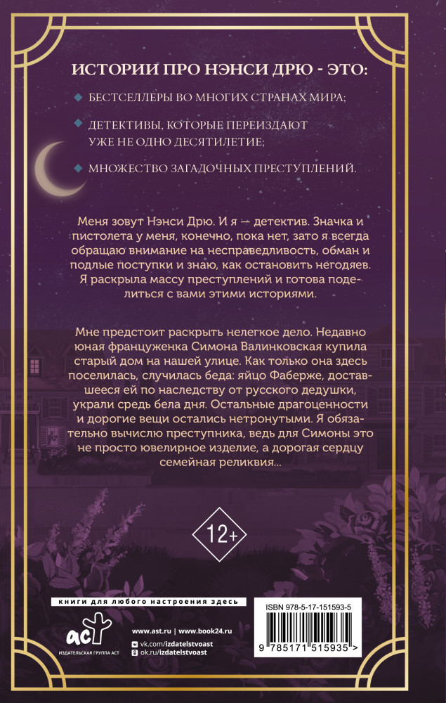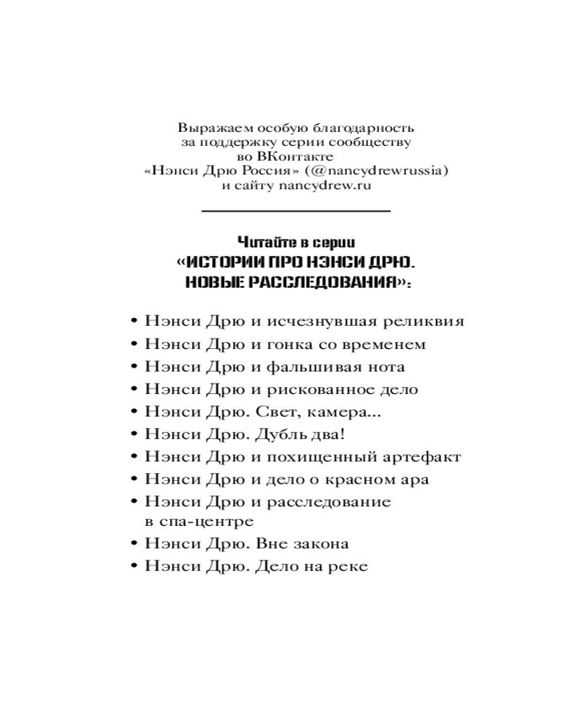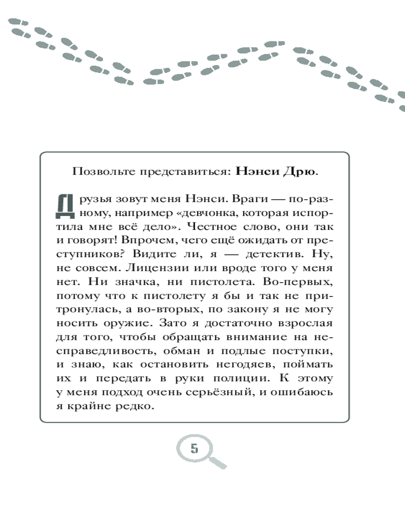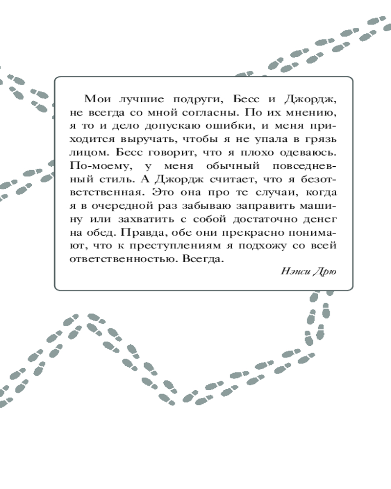 В данный момент этот товар отсутствует в продаже. Возможно, у нас найдется аналогичный или похожий товар здесь. Серия: Истории про Нэнси Дрю. Новые расследования. Новое оформление Меня зовут Нэнси Дрю. И я — детектив. Значка и пистолета у меня, конечно, пока нет, зато я всегда обращаю внимание на несправедливость, обман и подлые поступки и знаю, как остановить негодяев. Я раскрыла массу преступлений и готова поделиться с вами этими историями.