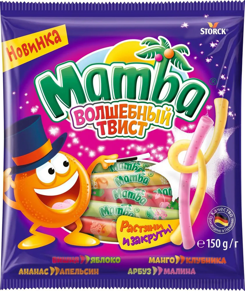 Встречайте новинку «Волшебный Твист» от любимого бренда Mamba! Необычная форма конфет в виде палочек, с которыми можно играть: тянуть и крутить! Mamba «Волшебный Твист» — эти конфеты чудесным образом меняют свой вкус! Попробуй удивительные превращения: Ананас-Апельсин, Вишня-Яблоко, Арбуз-Малина, Манго-Клубника. У конфет необычная форма в виде палочек, с которыми можно играть: растянуть или закрутить. |