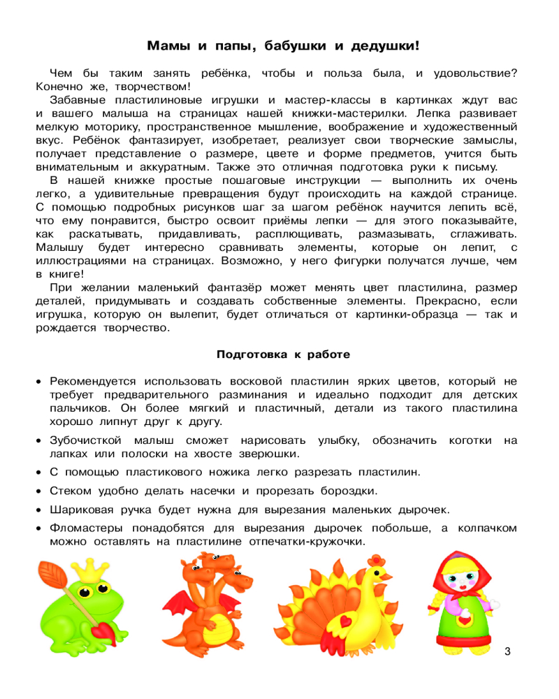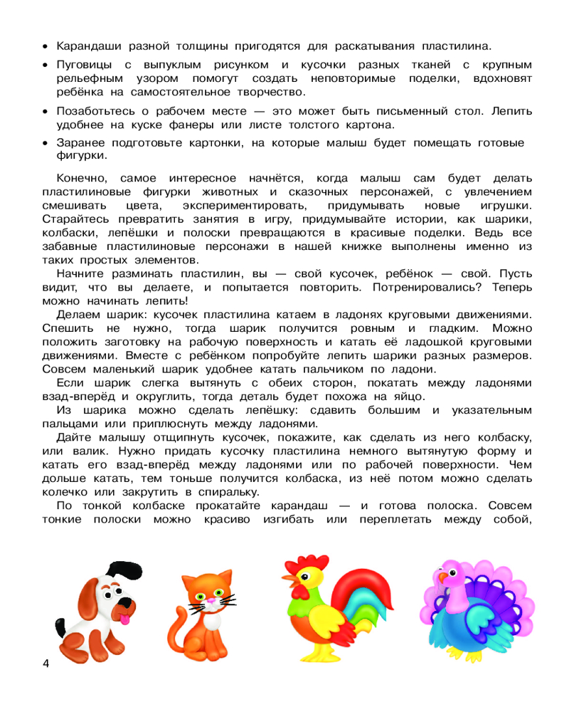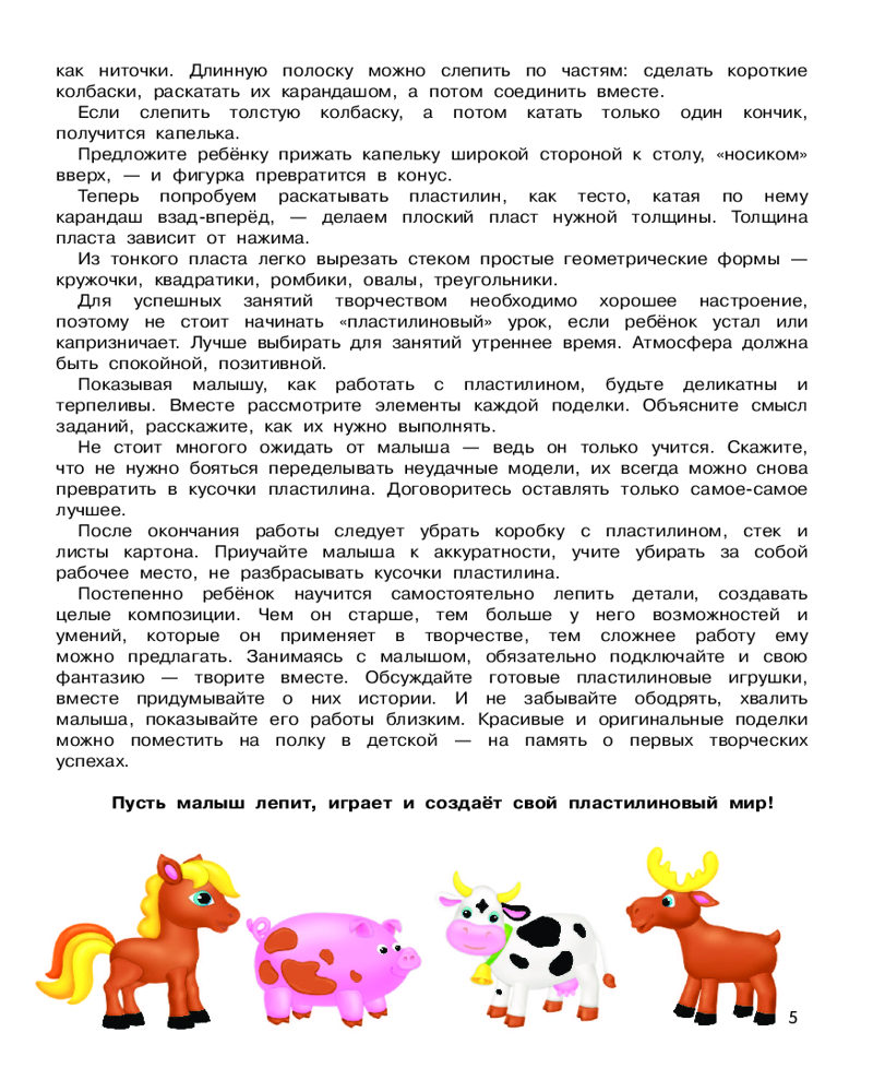 Серия: Большой самоучитель для маленьких Лепить из пластилина вместе с детьми — незабываемое удовольствие! На страницах книги «Лепим из пластилина: смотри и повторяй» — интересные мастер-классы, которые помогут создать необычные объёмные картинки, фигурки животных и сказочных персонажей. Занимаясь лепкой по нашей книжке, малыши не только играют, они думают, фантазируют, изобретают, реализуют свои творческие замыслы, тренируют пальчики, развивают пространственное мышление, воображение и художественный вкус. Удовольствие и положительные эмоции гарантированы! |