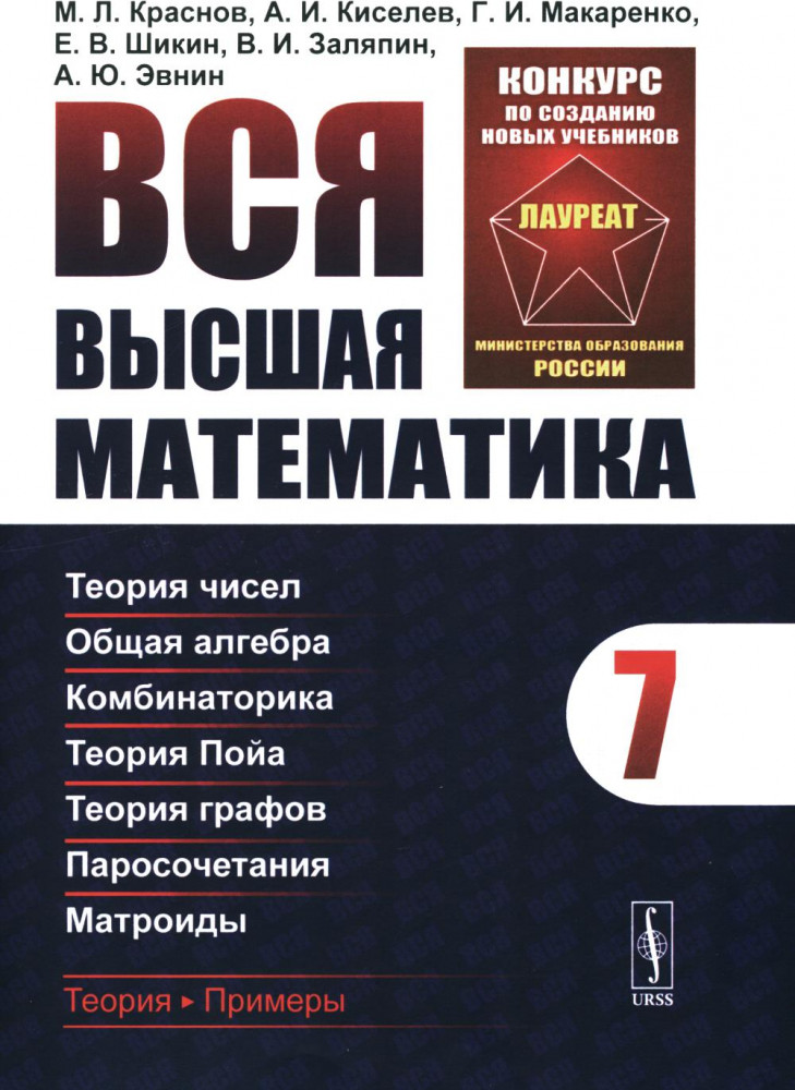 Данный учебник охватывает практически все разделы математики, но при этом представляет собой не набор разрозненных глав, а единое целое. Седьмой том включает в себя материал по теории чисел, комбинаторике и теории графов. В первых двух главах тома рассматриваются элементы теории чисел и общей алгебры. Вводимые при этом понятия широко используются в других главах, в частности при изложении теории Пойа, позволяющей решать задачи пересчета объектов с точностью до того или иного отношения эквивалентности. В главе, посвященной комбинаторике, помимо начальных сведений о выборках излагается принцип включения-исключения, эффективно работающий при решении классических комбинаторных задач. Здесь также описывается аппарат производящих функций — мощное средство комбинаторного анализа. В заключительных главах вводятся основные понятия теории графов и матроидов, описываются некоторые эффективные алгоритмы.