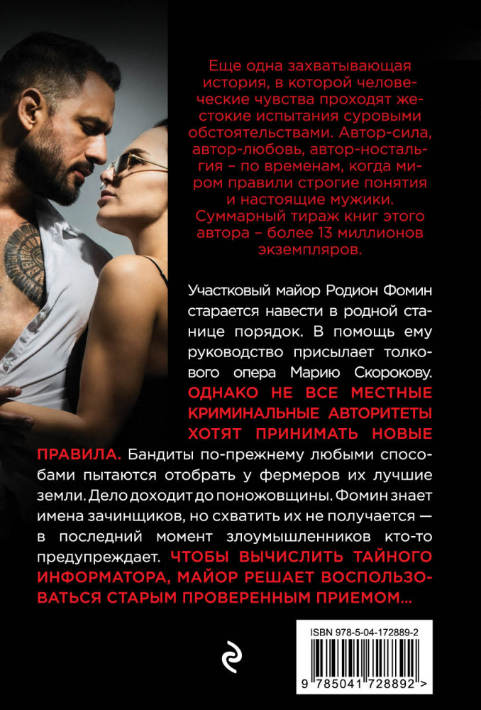 В данный момент этот товар отсутствует в продаже. Возможно, у нас найдется аналогичный или похожий товар здесь. Серия: Колычев. Роковой соблазн (обложка) Участковый майор Родион Фомин старается навести в родной станице порядок. В помощь ему руководство присылает толкового опера Марию Скорокову. Однако, не все местные криминальные авторитеты хотят принимать новые правила. Бандиты по-прежнему любыми способами пытаются отобрать у фермеров их лучшие земли. Дело доходит до поножовщины. Фомин знает имена зачинщиков, но схватить их не получается — в последний момент злоумышленников кто-то предупреждает. Чтобы вычислить тайного информатора, майор решает воспользоваться старым проверенным приемом...