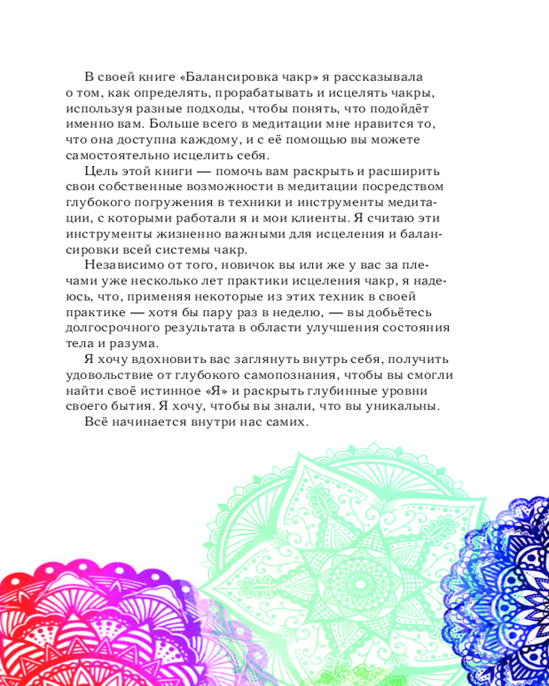 Чакра-медитации. Пробудите свою исцеляющую силу с помощью медитации и визуализациицветность понятные практики рабочие практики полезность В данный момент этот товар отсутствует в продаже. Возможно, у нас найдется аналогичный или похожий товар здесь. Серия: Чакры. Семь ступеней к гармонии Чакры являются жизненно важными энергетическими центрами всего тела, и их здоровье может влиять как на физическое, так и на психическое благополучие. Избавиться от усталости, стресса и плохого самочувствия можно, наладив энергообмен в чакрах. 5, 15 или 30 минут в день — столько нужно, чтобы пробудить свою внутреннюю исцеляющую силу и улучшить самочувствие при помощи медитаций. |