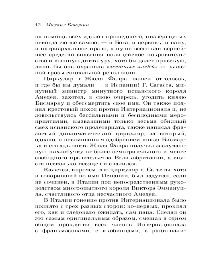 Серия: Pocket Book (обложка) Михаил Бакунин (1814–1876) — общественный деятель, философ-революционер и идеолог анархизма. Воспитанный на идеях немецкой философии, он участвовал во многих европейских революционных движениях, где выступал за уничтожение государств как таковых и создание федералистических объединений на основе равенства и справедливости. Ярый сторонник идеи панславянизма и главный оппонент Карла Маркса в отношении «диктатуры пролетариата», Бакунин под конец жизни сам был вынужден признать безграничную пропасть между своим анархическим мировоззрением в теории и на практике. |
