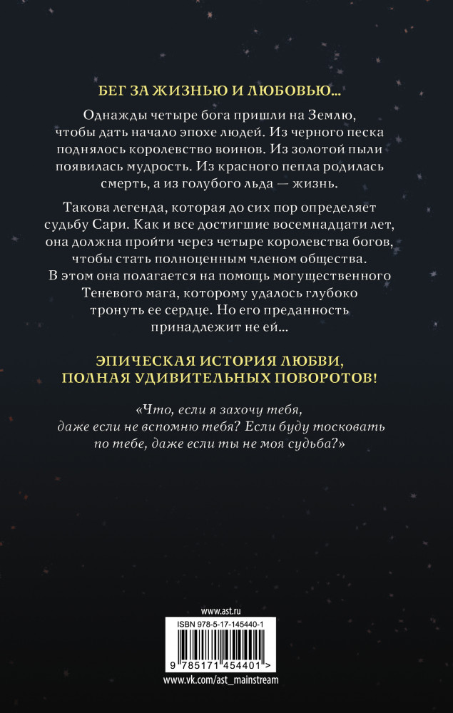 Такова легенда, которая до сих пор определяет судьбу Сари. Как и все достигшие восемнадцати лет, она должна пройти через четыре королевства богов, чтобы стать полноценным членом общества. В этом она полагается на помощь могущественного Теневого мага, которому удалось глубоко тронуть ее сердце. Но его преданность принадлежит не ей...