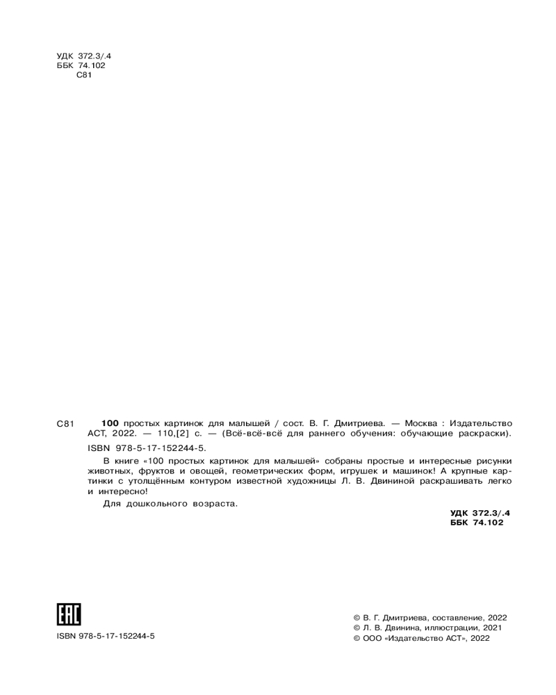💳 Оплатить за товар можно при получении 🇰🇿 Есть бесплатная доставка по Казахстану 🎁 Копите бонусы с каждой покупки Серия: Всё-всё-всё для раннего обучения: обучающие раскраски В книге «100 простых картинок для малышей» собраны простые и интересные картинки животных, фруктов и овощей, геометрических форм и многого другого! А крупные картинки с утолщённым контуром известной художницы Л. В. Двининой раскрашивать легко и интересно! |