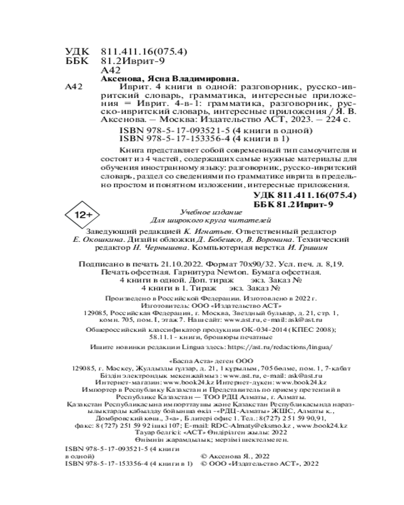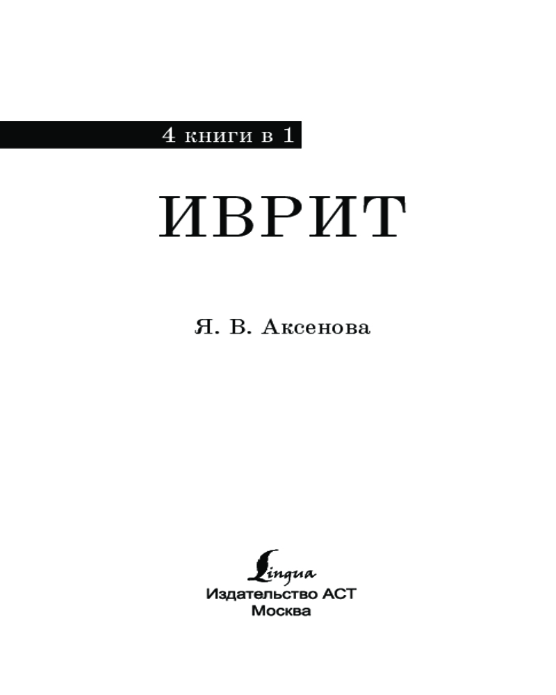Иврит. 4-в-1: грамматика, разговорник, русско-ивритский словарь, интересные приложенияВ данный момент этот товар отсутствует в продаже. Возможно, у нас найдется аналогичный или похожий товар здесь. Серия: 4 книги в 1 Книга представляет собой современный тип самоучителя и состоит из 4 частей, содержащих самые нужные материалы для обучения иностранному языку: разговорник, русско-ивритский словарь, раздел со сведениями по грамматике иврита в предельно простом и понятном изложении, интересные приложения. |